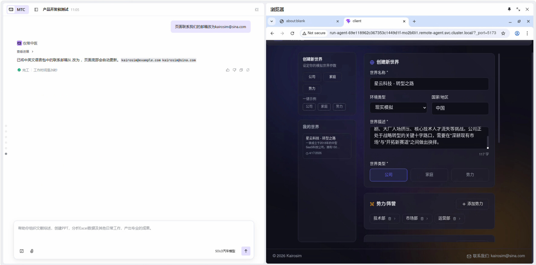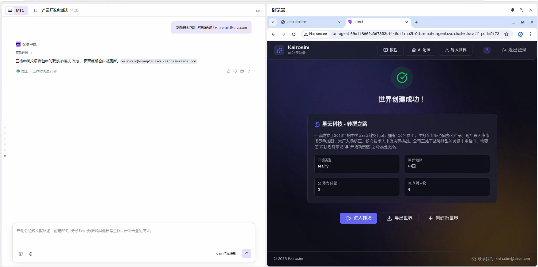 Kairosim 是一款 AI 驱动的决策推演工具。用户用自然语言构建虚拟世界(公司/家庭/势力),系统通过多轮推演生成多种分支走向,支持干预事件插入、多视角并行推演和结构化评估报告,帮助用户在复杂情境下探索不同决策路径,实现"从脑补到可交互实验"的决策方式升级。