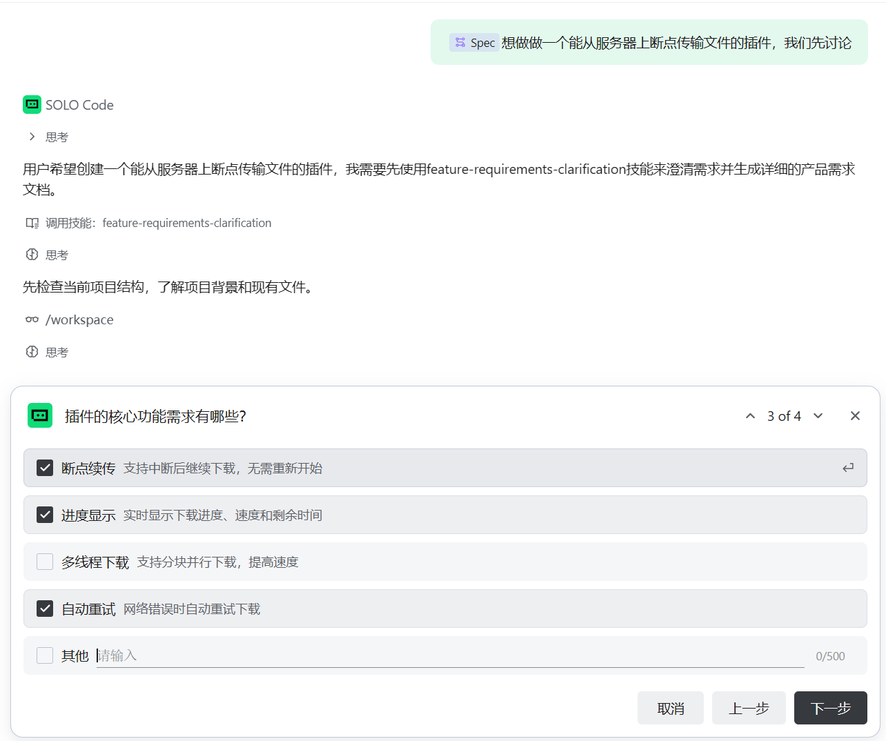 用 SOLO 模式和 AI 讨论开发方案的过程中,AI 会时不时弹出对话选项让我做选择,大概长这样: