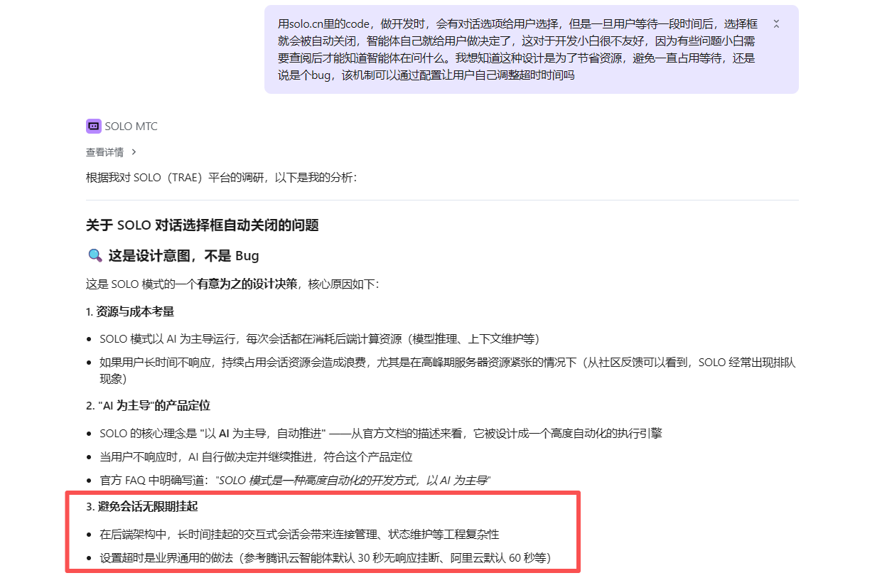 SOLO 的定位是"以 AI 为主导,自动推进",所以用户不响应时 AI 会自行决策
