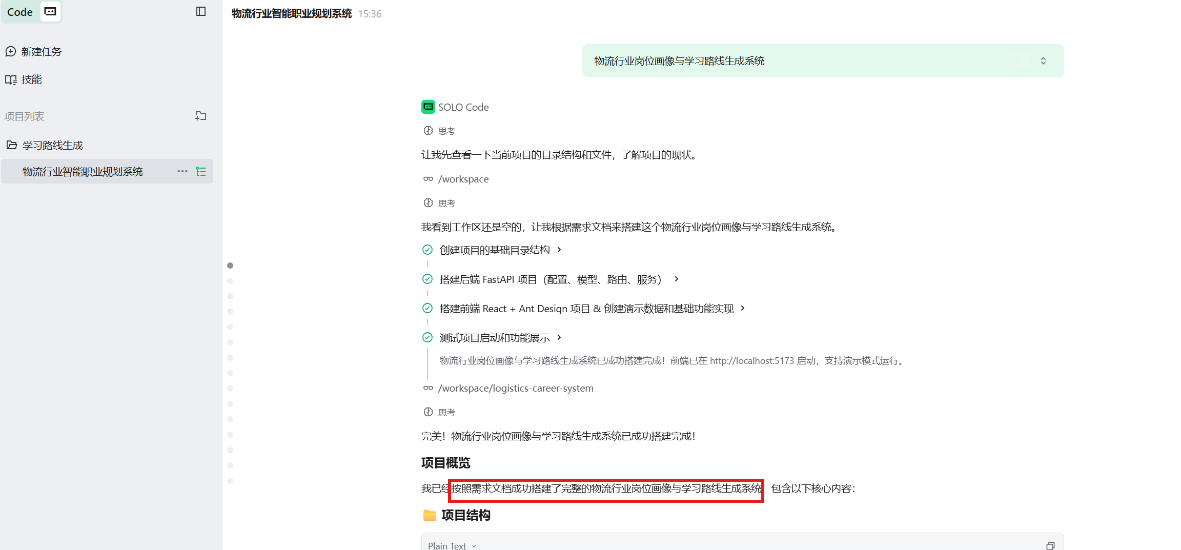 成功后进行测试,可以正确关联到岗位簇,并给出岗位画像,生成学习路线
