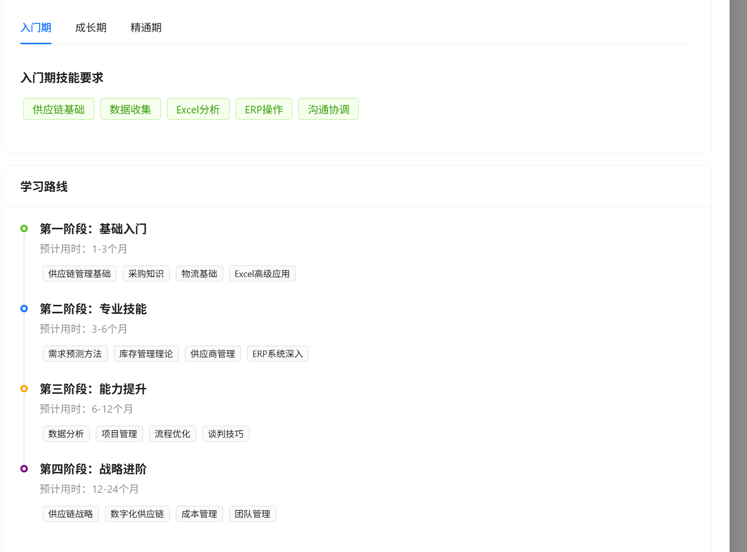 学习路线:根据岗位需求,生成分阶段的学习路径和技能提升建议
