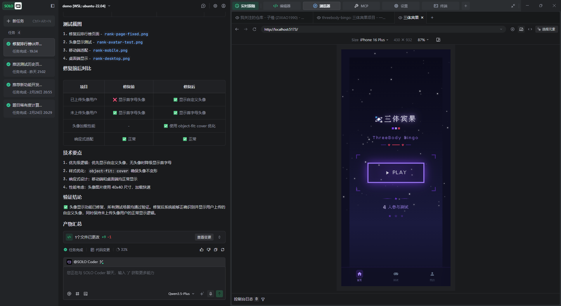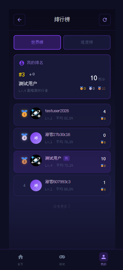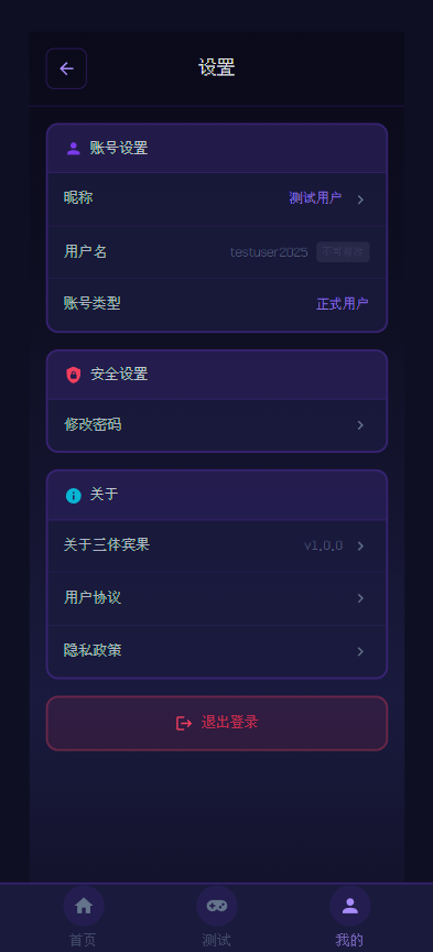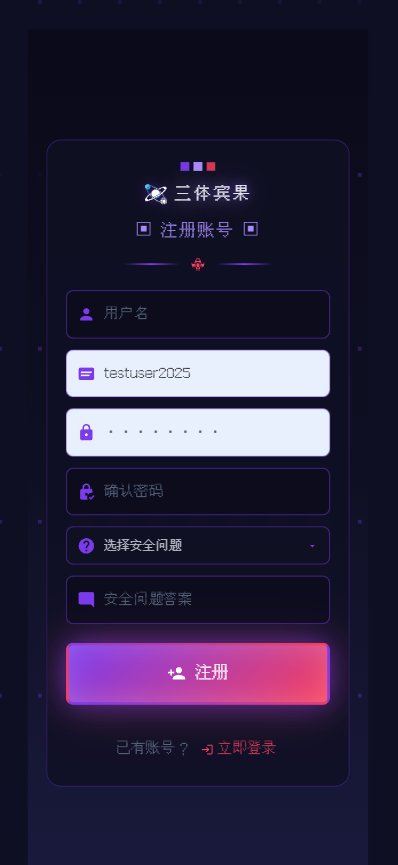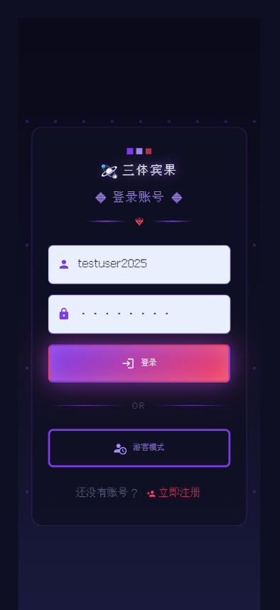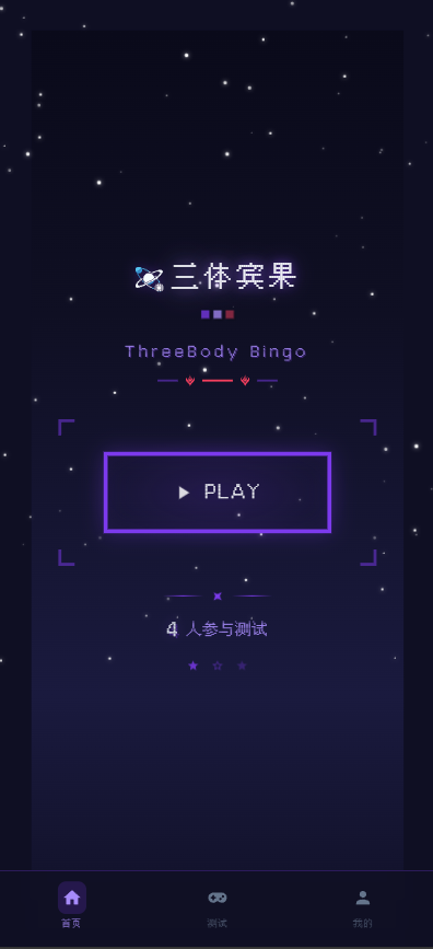 我呢是三体频道的管理者,为社区开发了一款测试游戏,全是业余时间做的,本身没有开发基础,全靠trae cn,而且一分钱没花,大概就是两周的时间做出来的,以下: