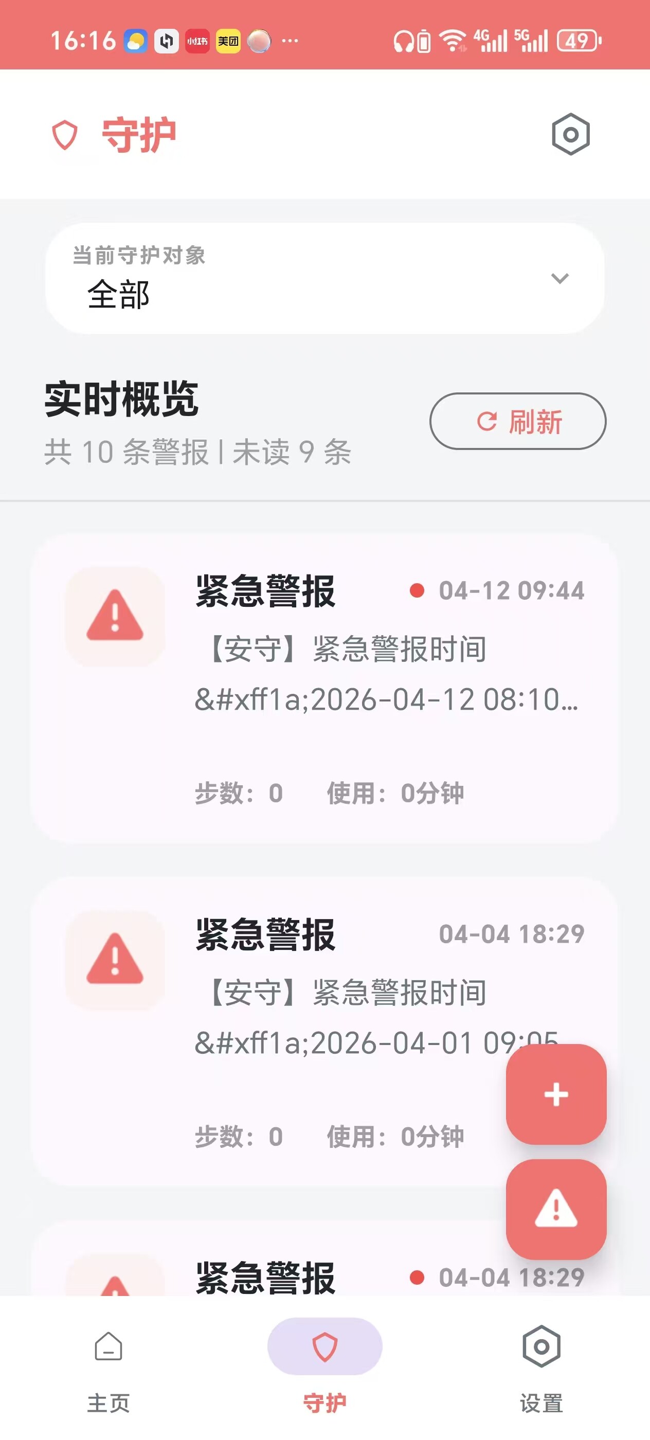 刷新按钮以下的 警报记录部分好像是不可滑动界面,把它改为可滑动的。警报记录部分的“下拉刷新或添加守护对象”文本,有一部分溢出到导航栏下面了,被导航栏遮挡了,把警报记录部分的文本和守护的svg图标统一向上移动一些”