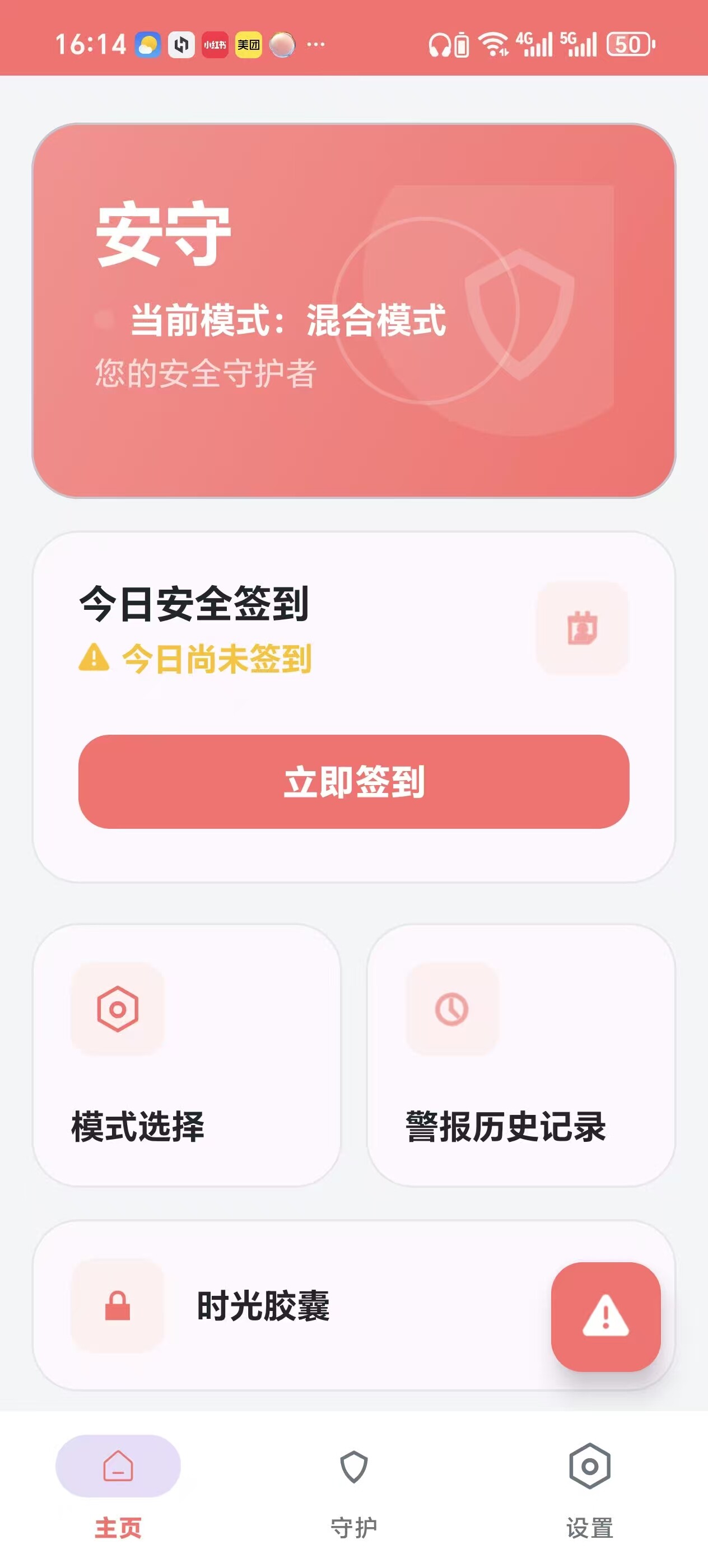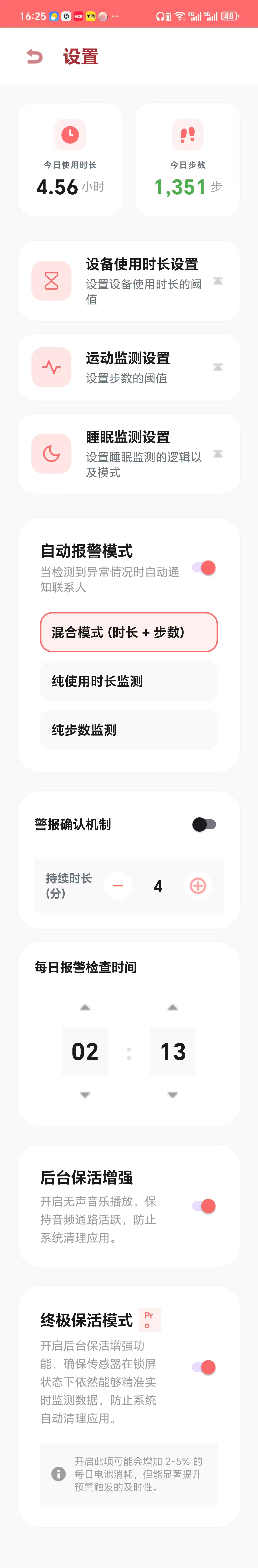 “安守”是一款致力于实现“无感化”监测的 Android 智能守护应用。它深度融合了加速度计、陀螺仪及计步器等多维传感器数据,通过自研算法实时分析用户的运动状态、手机使用习惯及睡眠质量。在确保极低功耗与后台稳定保活的前提下,系统能精准识别异常行为(如长时间失联或未签到),并自动触发多级预警机制通知紧急联系人。