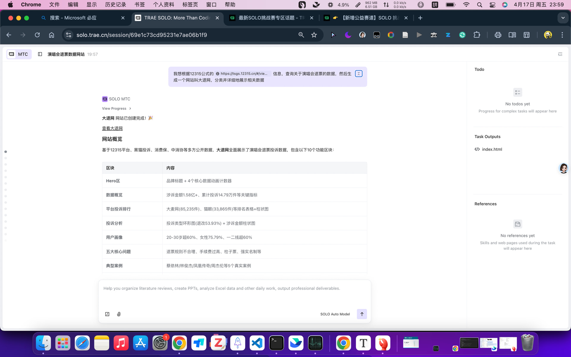 用TRAE SOLO从零搭建了大退网,一句想法就搭建了比我初衷还好的网站,数据全面而且网页也非常好看(没错,就是对标大卖网,哼