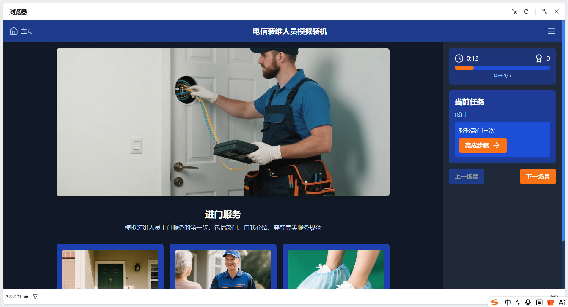 游戏流程页面:模拟5个装维服务场景,每个场景包含多个任务