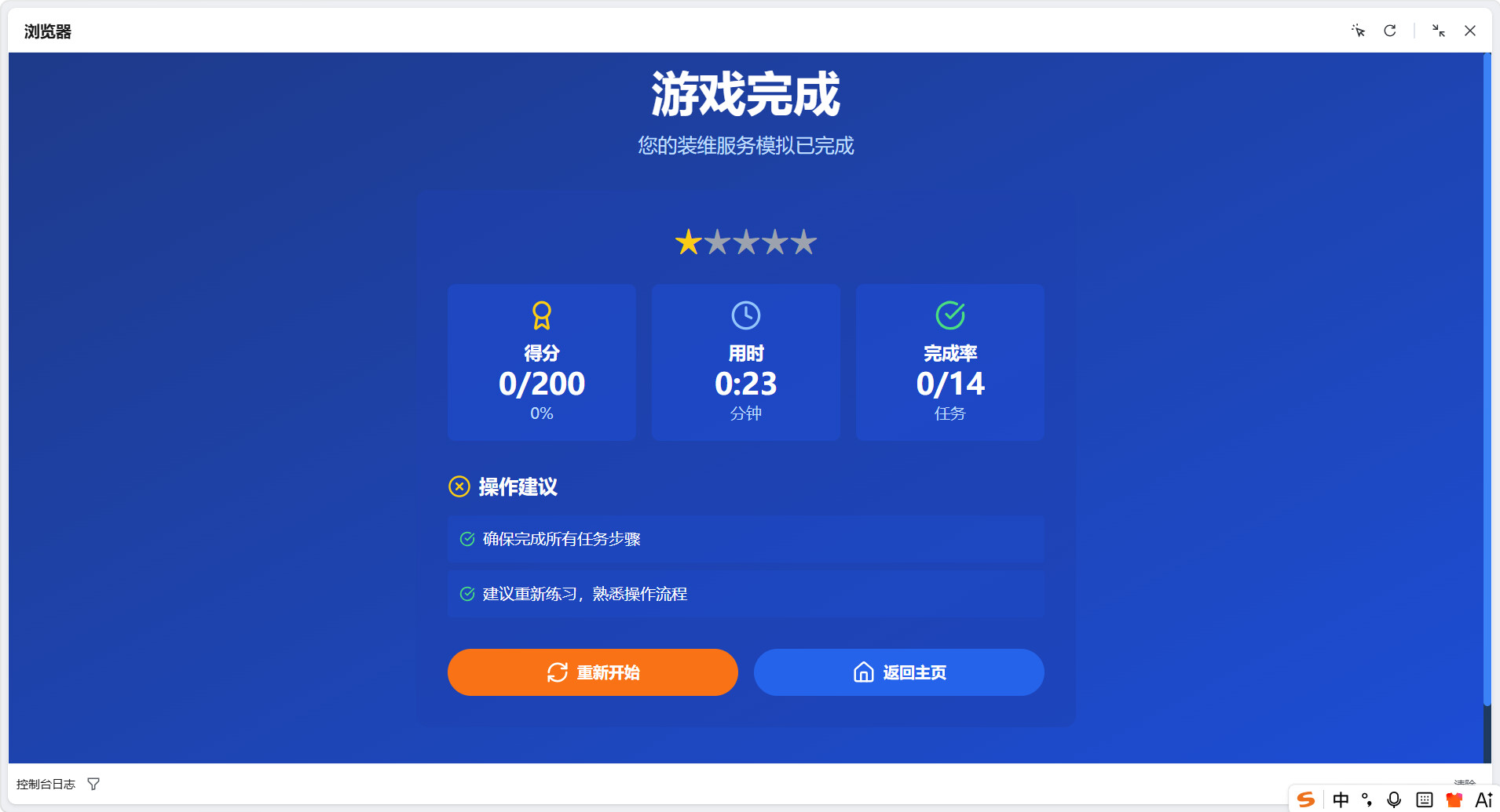 结果页面:显示评分结果、操作建议和重新开始选项