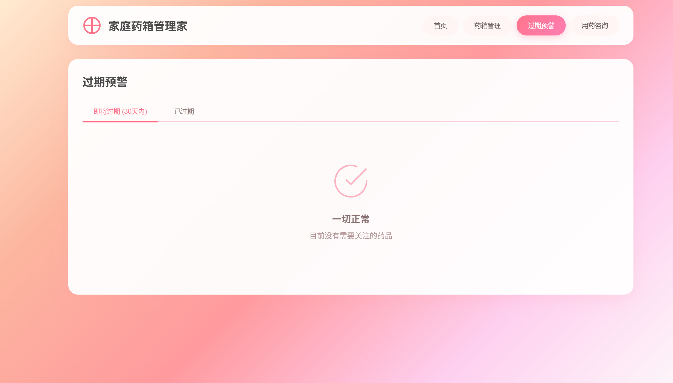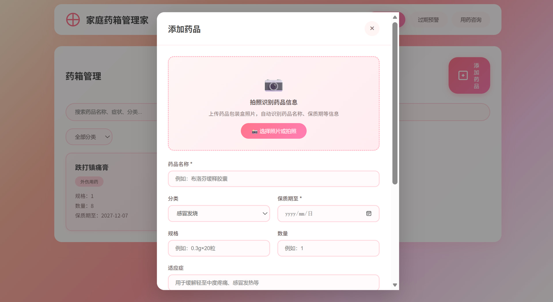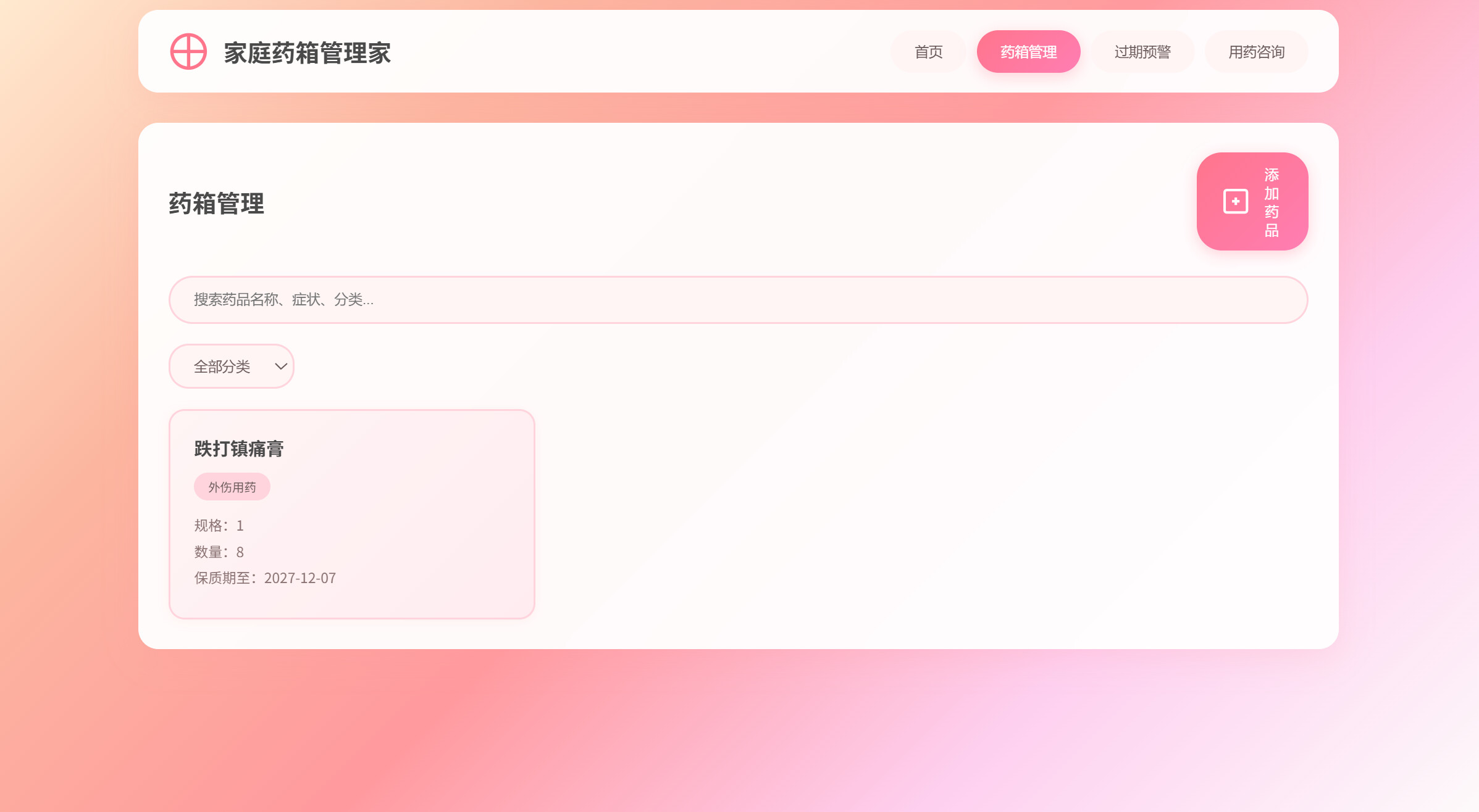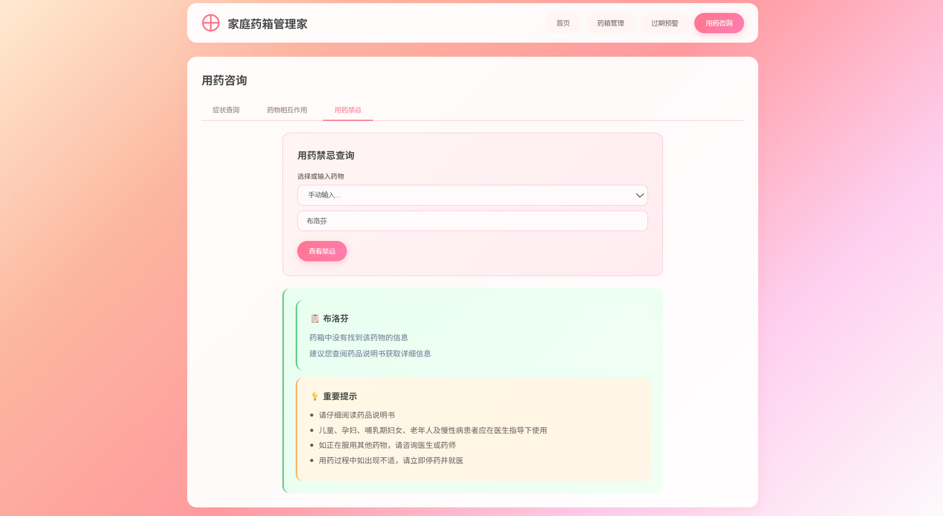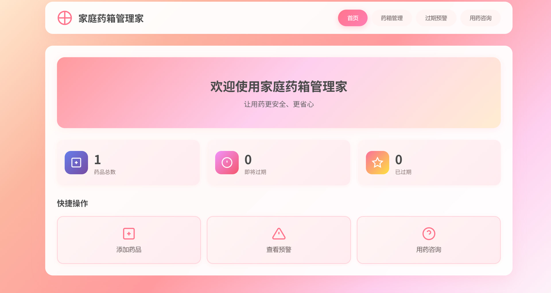 作为一名计算机专业的学生,我发现家人和朋友常面临两类用药困扰:一是药品开封痊愈后就被遗忘在药箱,等到急需时才发现已过期;二是身体不适时,面对药箱里的多种药品,不确定能否一起吃、怎么搭配效果更好。为了解决这些痛点,我决定开发一个完全运行在浏览器本地、保护隐私的“家庭药箱管家”网页应用,帮助大家科学管理家庭小药箱