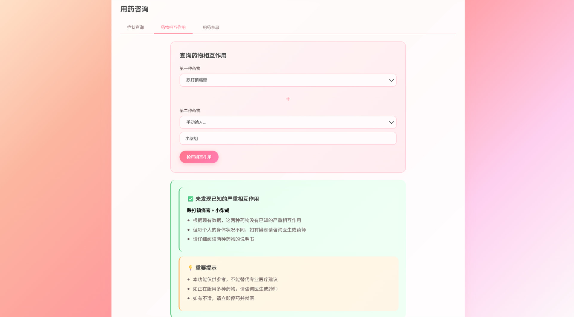 用药安全自查:内置简易相互作用知识库,支持输入两种药品查询能否同服。