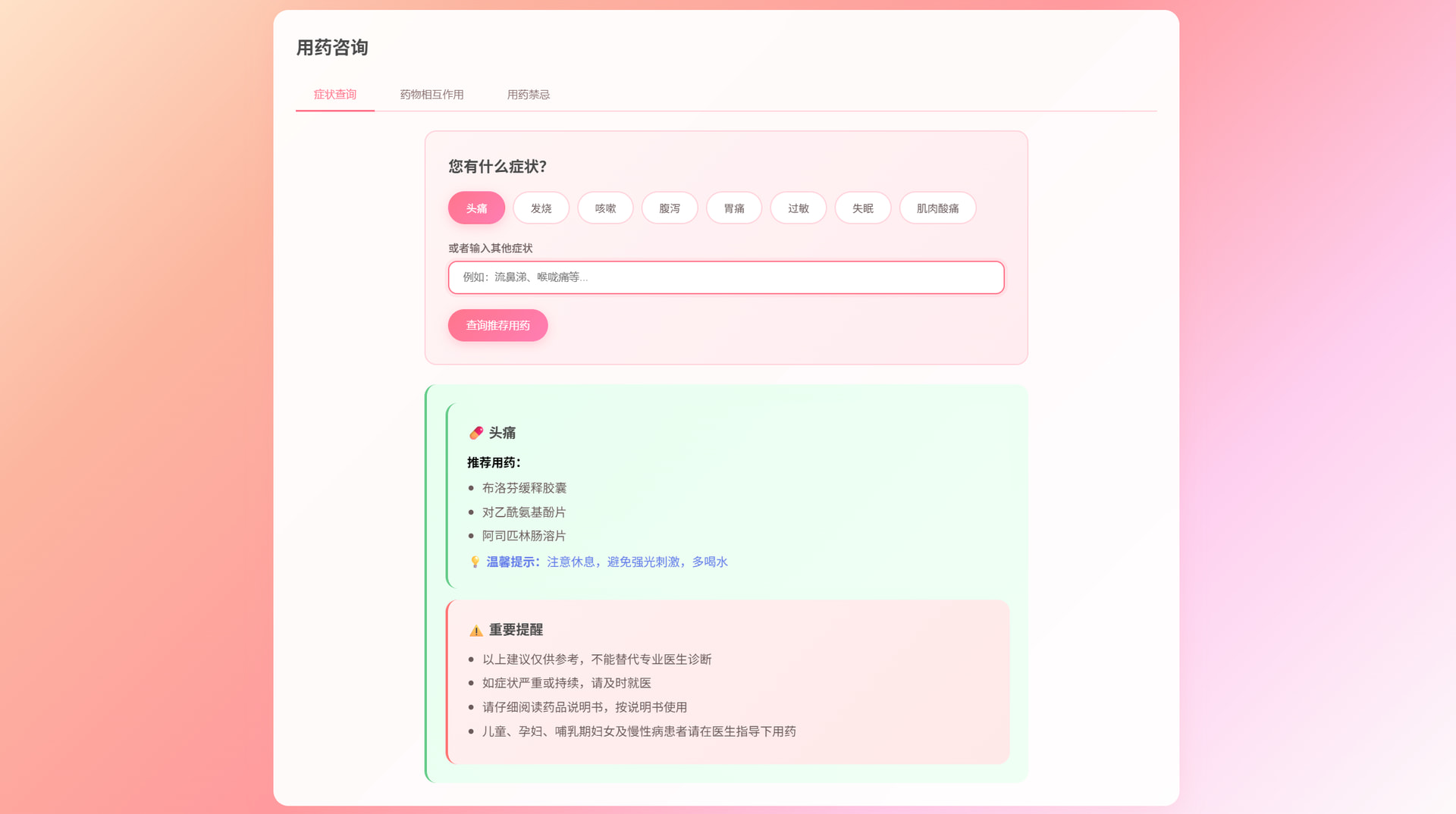 功能实现:实现基于 LocalStorage 的本地数据持久化、有效期自动计算与状态分类、简易相互作用知识库检索、症状与用药建议匹配。