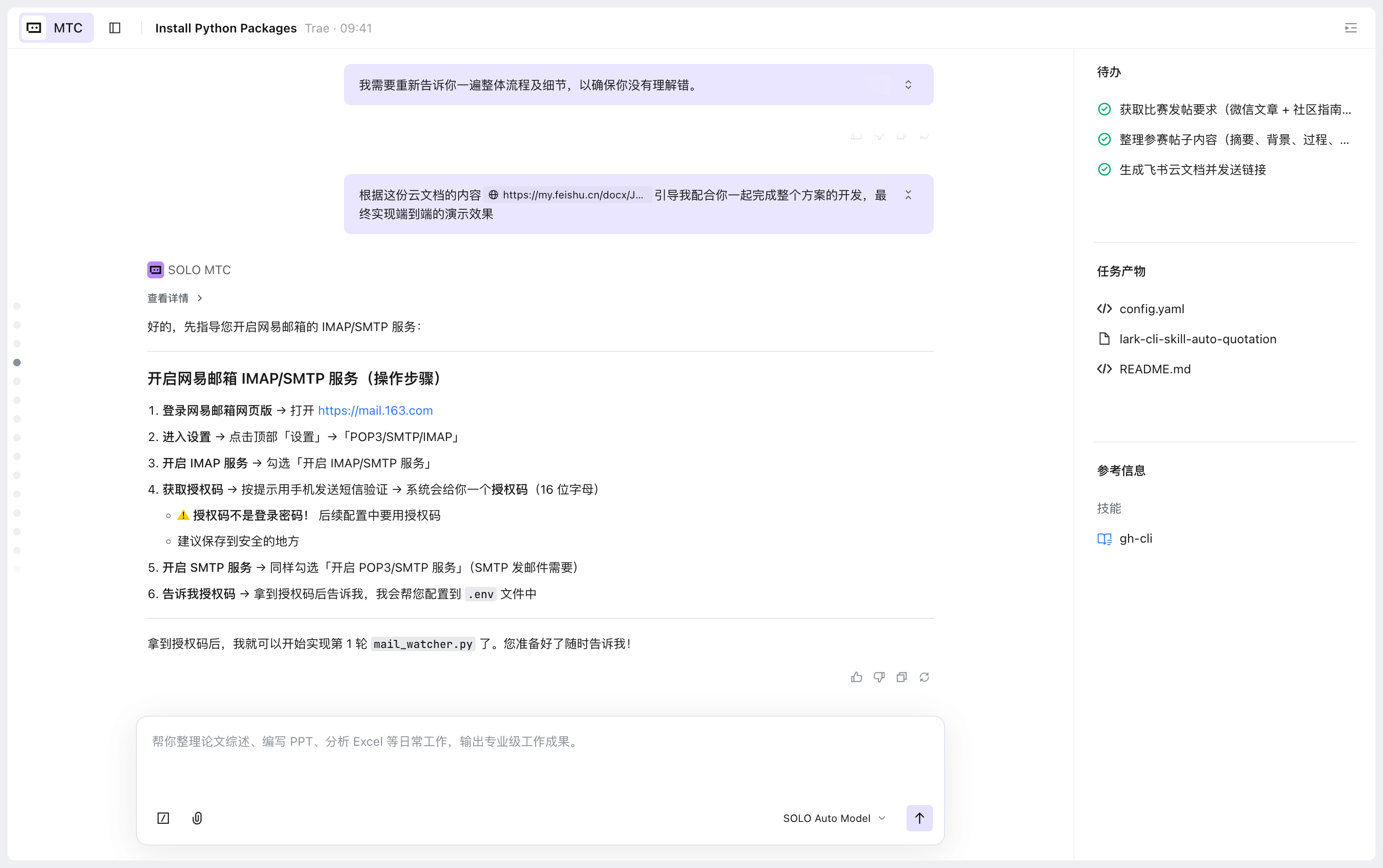 我按照SOLO给出的飞书云文档,逐个让 SOLO按依赖顺序实现各模块: