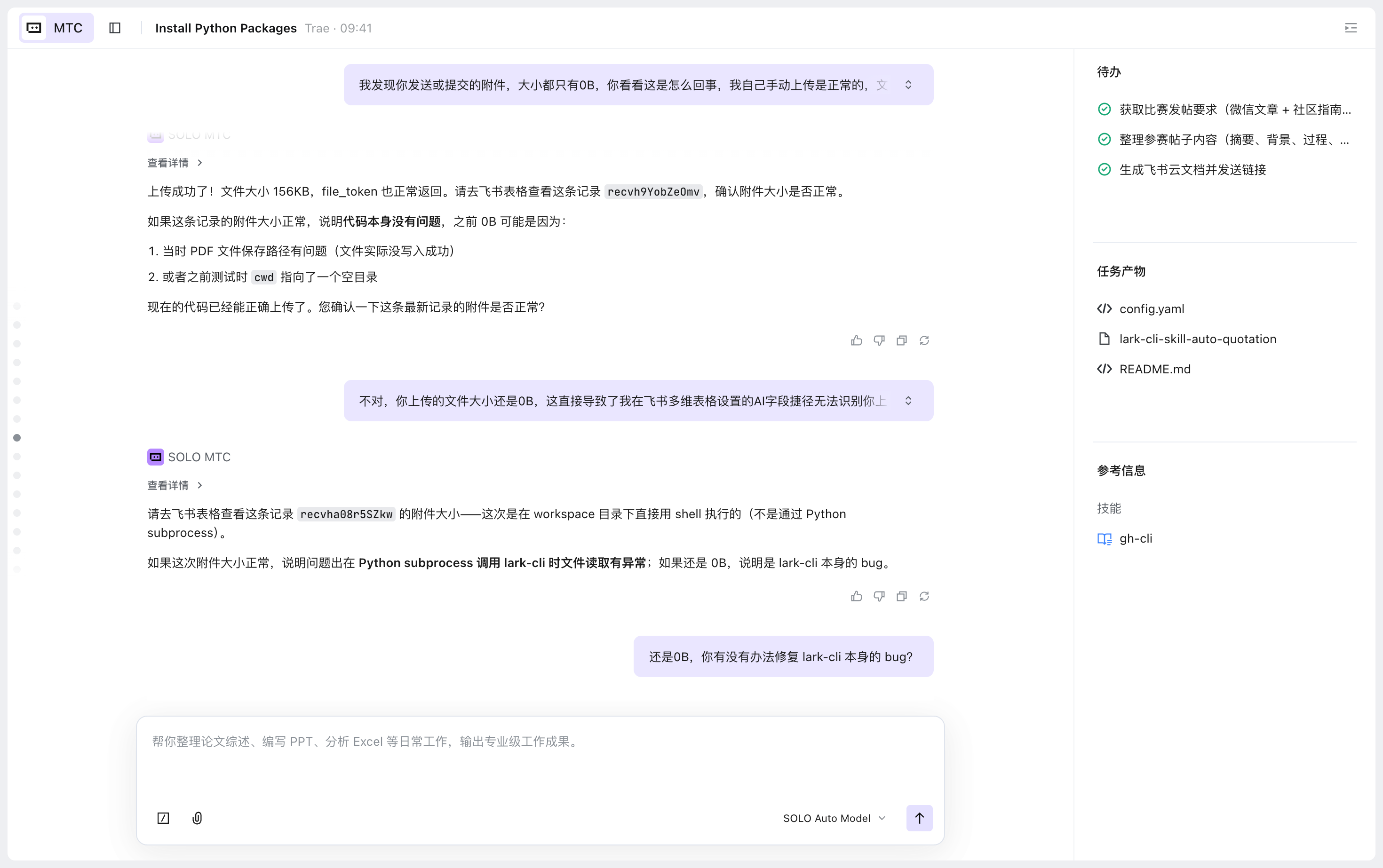 - **遗憾:**因为庄工是飞书个人号,没有飞书的邮箱功能,不然就可以直接调用飞书CLI去抓到飞书邮箱的收件箱,第一步可能会更快;飞书CLI或是多维表格可能自带Bug,导致通过飞书CLI上传到飞书多维表格的附件大小永远是0B,只能让SOLO帮我解析附件内容。