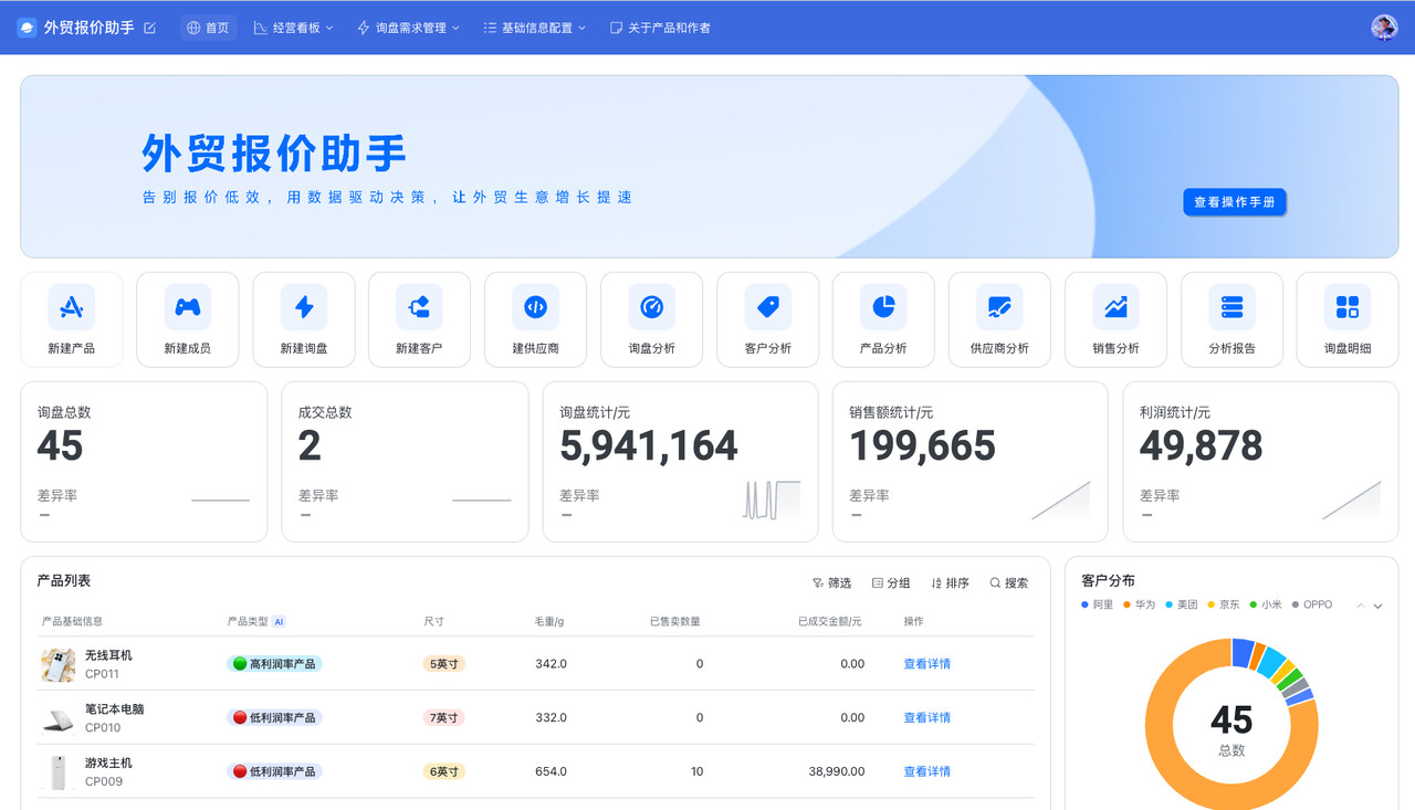 我是一名飞书多维表格的独立开发者,此前曾接触到一位外贸公司的老板。了解到外贸公司有几万个产品品类和型号在售,日常工作中最繁琐的环节之一就是处理客户询价。每次客户询盘都会咨询几十上百的品,业务员每天需要耗费4小时查询产品,计算报价,最终产出报价单。之后还需要记录这次报价,同步给业务主管、老板跟进情况。
