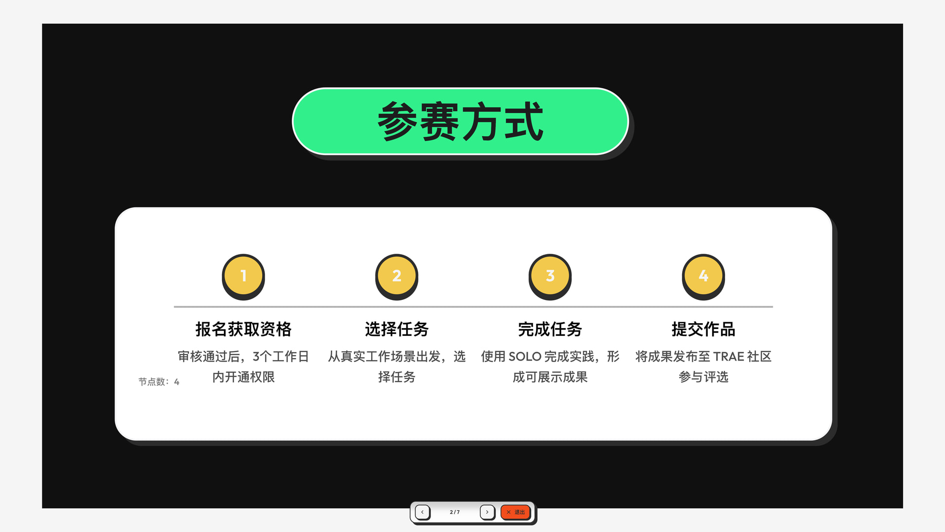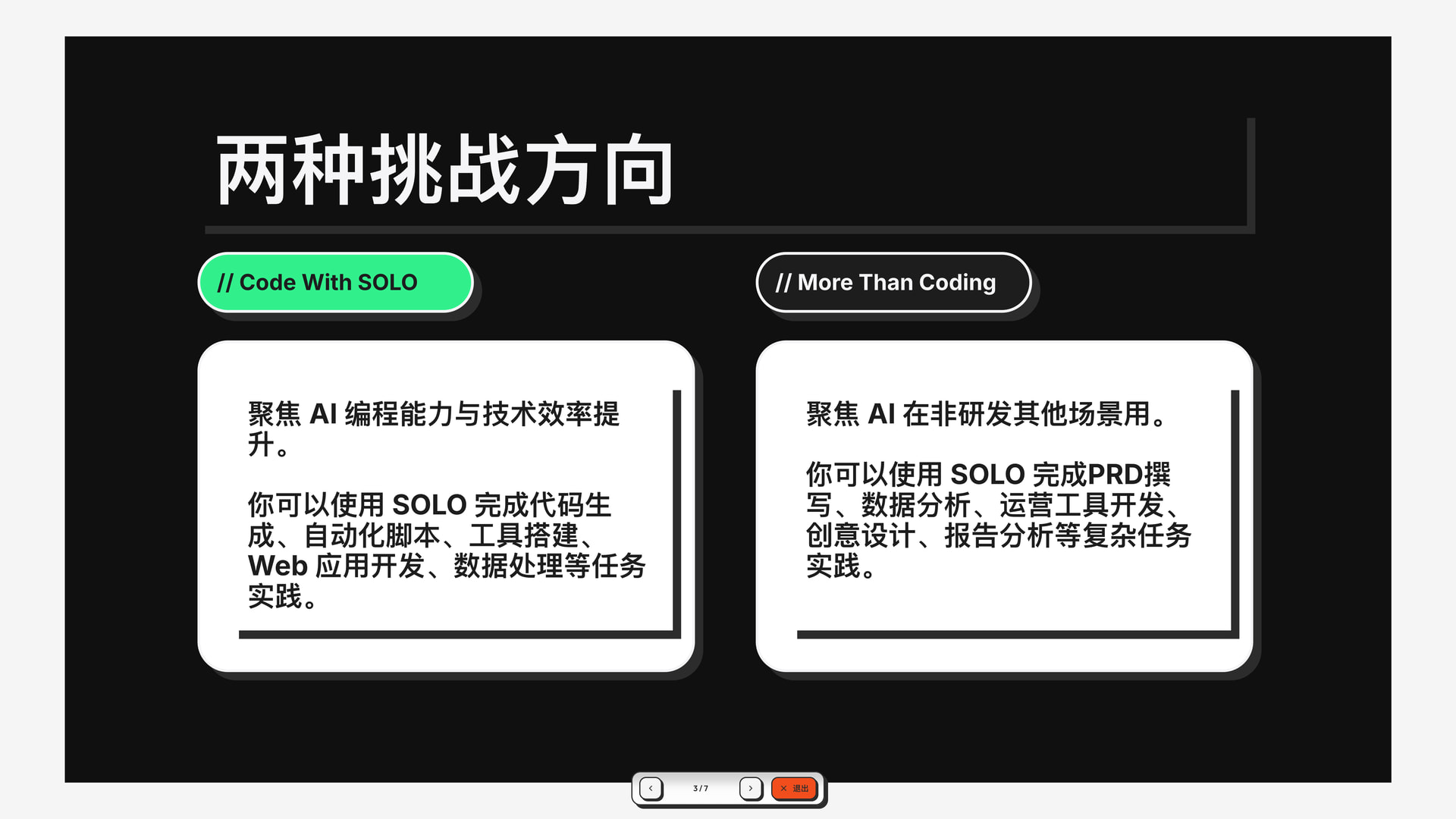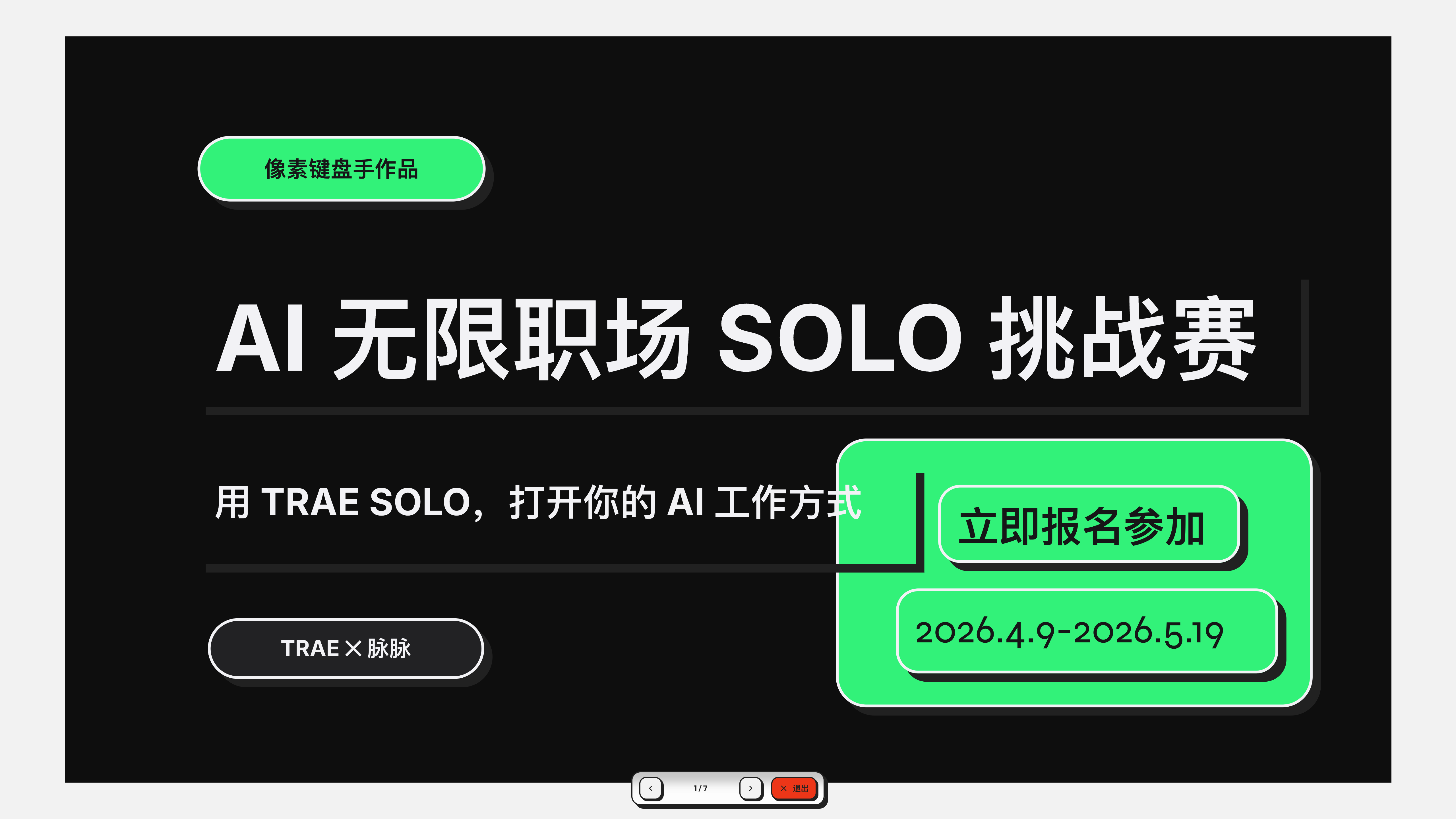 首先感谢 TRAE 产品的审美给了我创作这个应用的动力,我也把TRAE 的审美风格作为 AIPPTDeck 的其中一个模板设计进产品,我称之为 TRAE Tech Dark 风格,并用这个模板制作了本次挑战赛的 PPT。效果可以拉到最下面看。