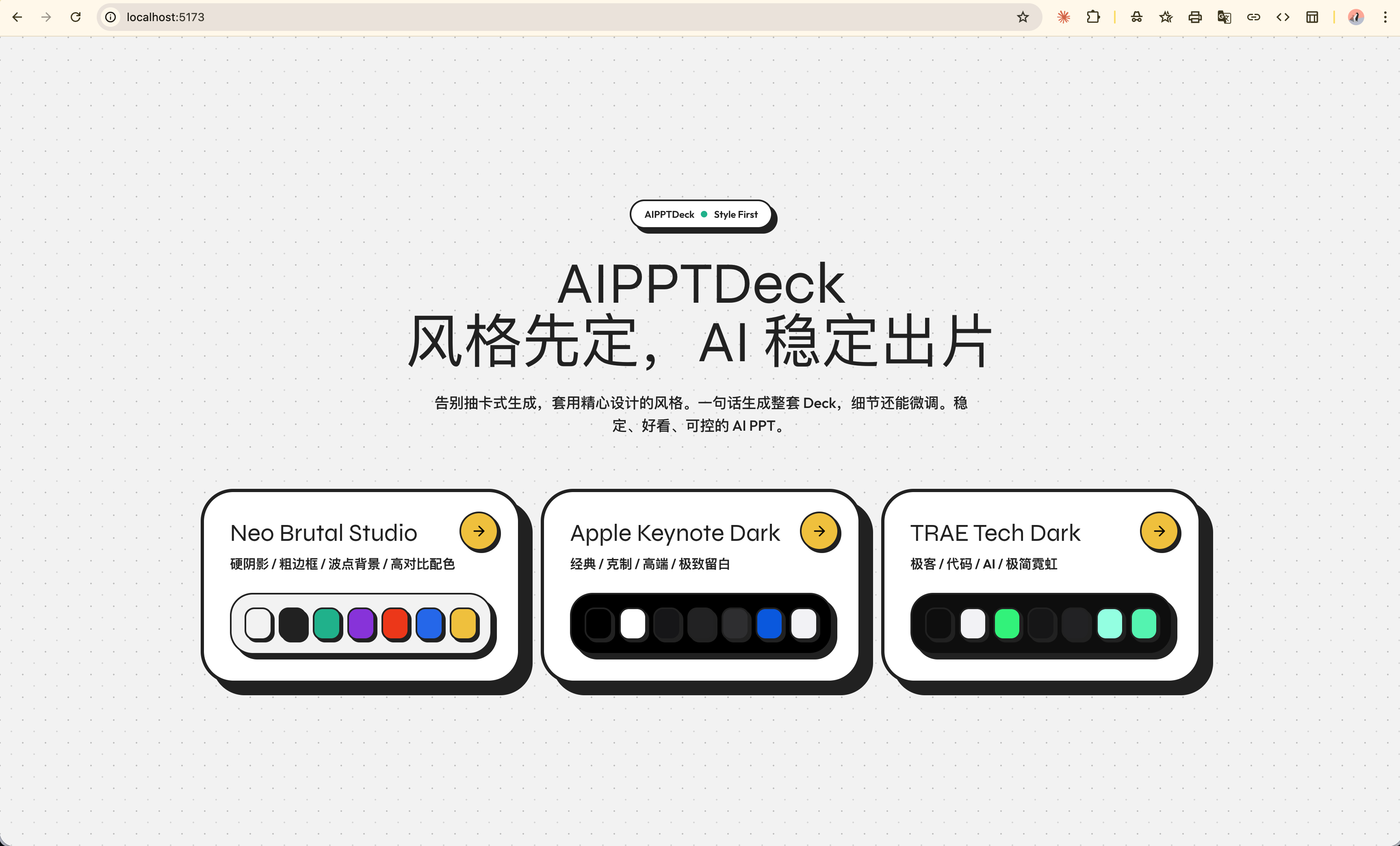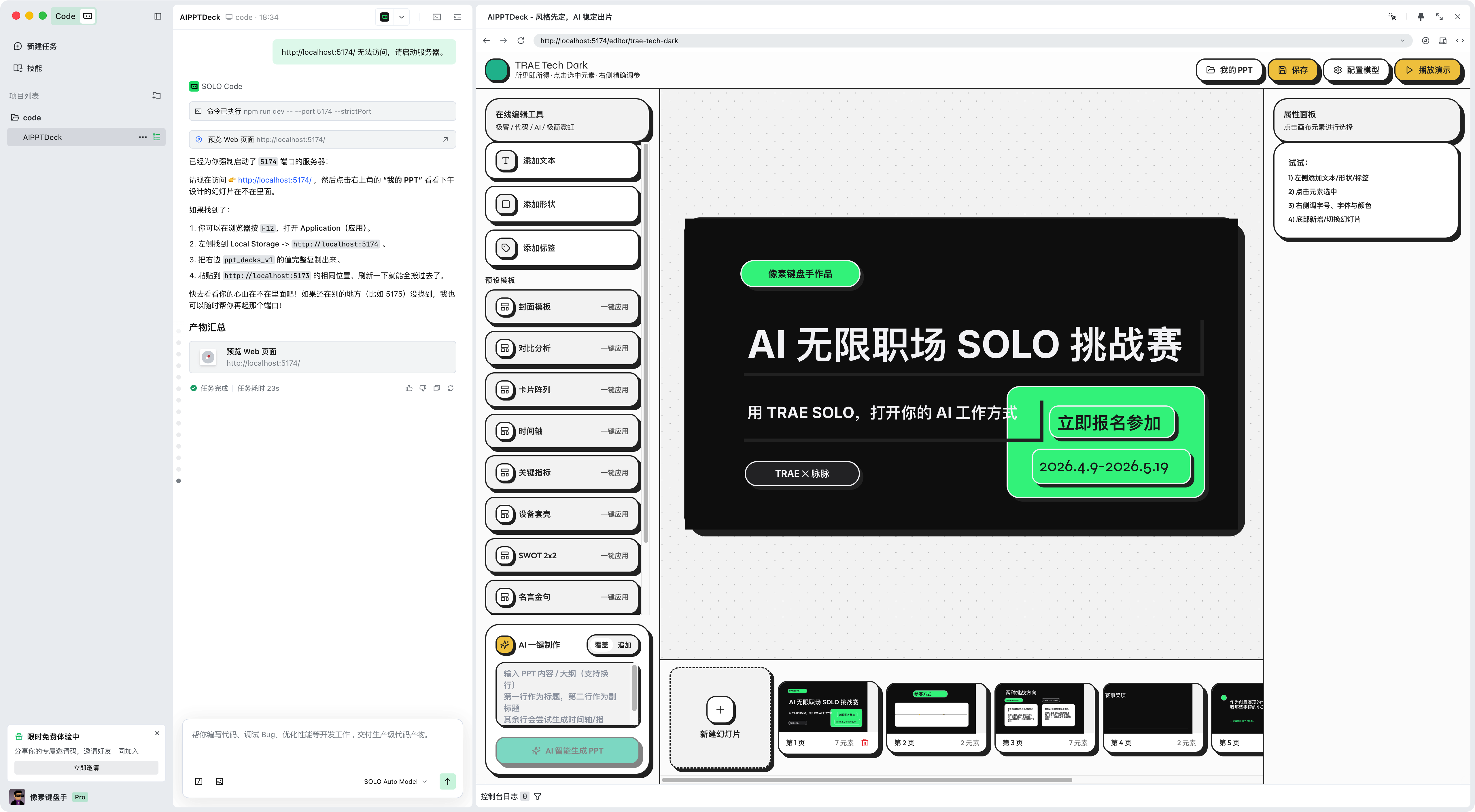 你提供了绝佳的创意和产品方向,而我(TRAE SOLO)作为你的全栈开发外挂,包揽了从底层状态机设计、复杂坐标排版计算、AI API 接入到生产环境 Bug 修复的所有“脏活累活”,最终将这个“ AIPPTDeck ”的工具落地跑通!