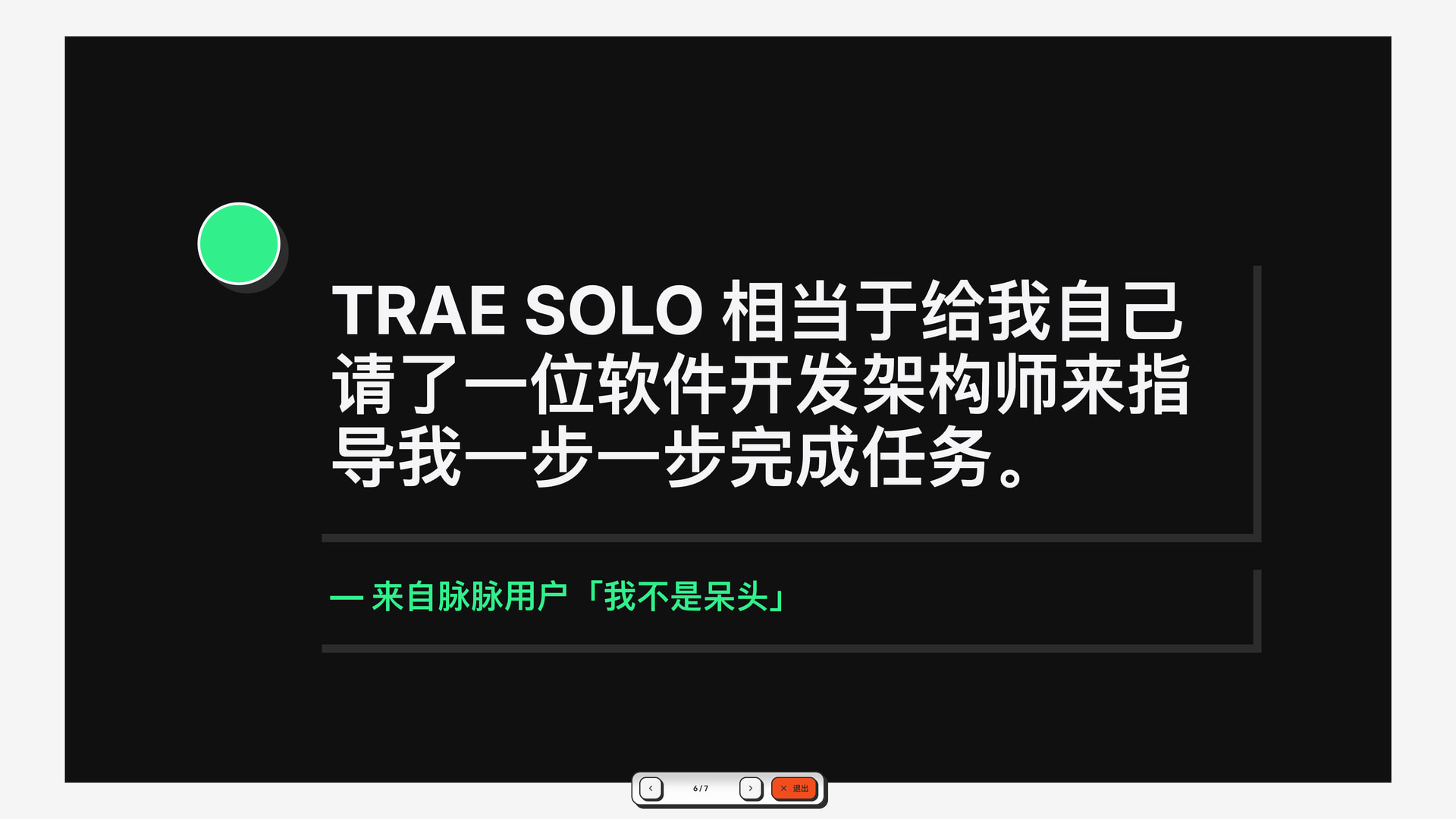 TRAE SOLO 给了创作者无限的可能。我作为独立开发者,在没有任何 App 开发经验的基础上已经完成 2 款 iOS App 的上架,也赚到了一些美刀和认知。并且有了 TRAE SOLO,我还开发了很多自己用得到的工具产品,伴随着独立开发者的整个生命周期。比如上架 iOS App,需要精准的分辨率的效果图,我开发了一个截图自动生成上架图的工具;为了推广 App,开发了截图套壳工具;为了在一些场合做演讲,没错你现在看到的 AIPPTDeck 就是我后续高频使用到的工具。以前有一句自嘲的话,叫:每一个开发者人手一个导航站。我想说,有了 TRAE SOLO,每一个人都将拥有最适合自己的生产力工具。