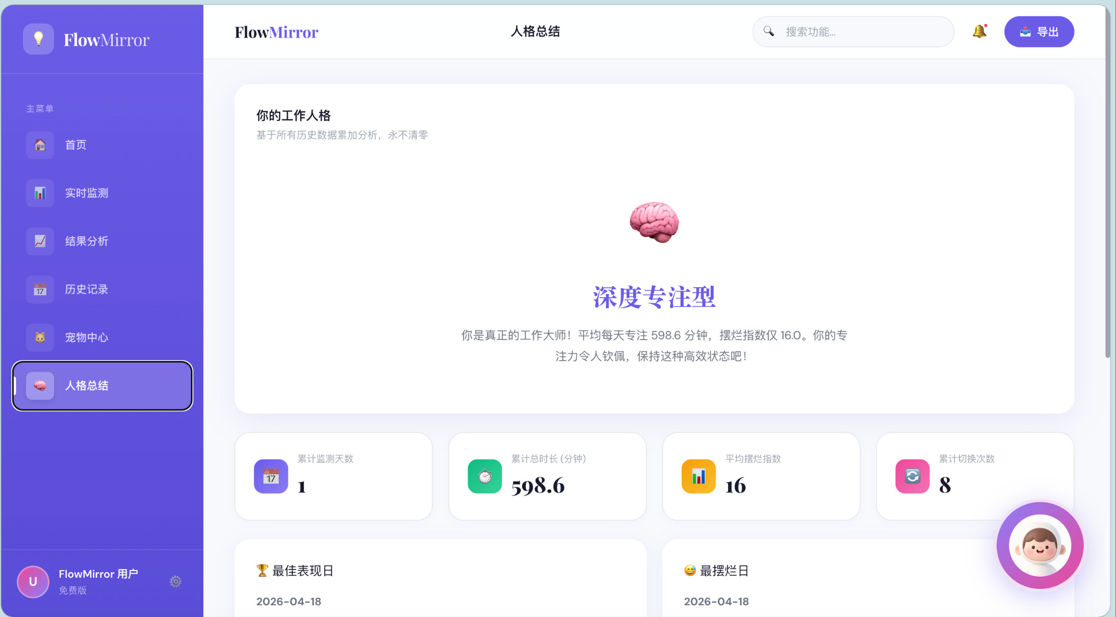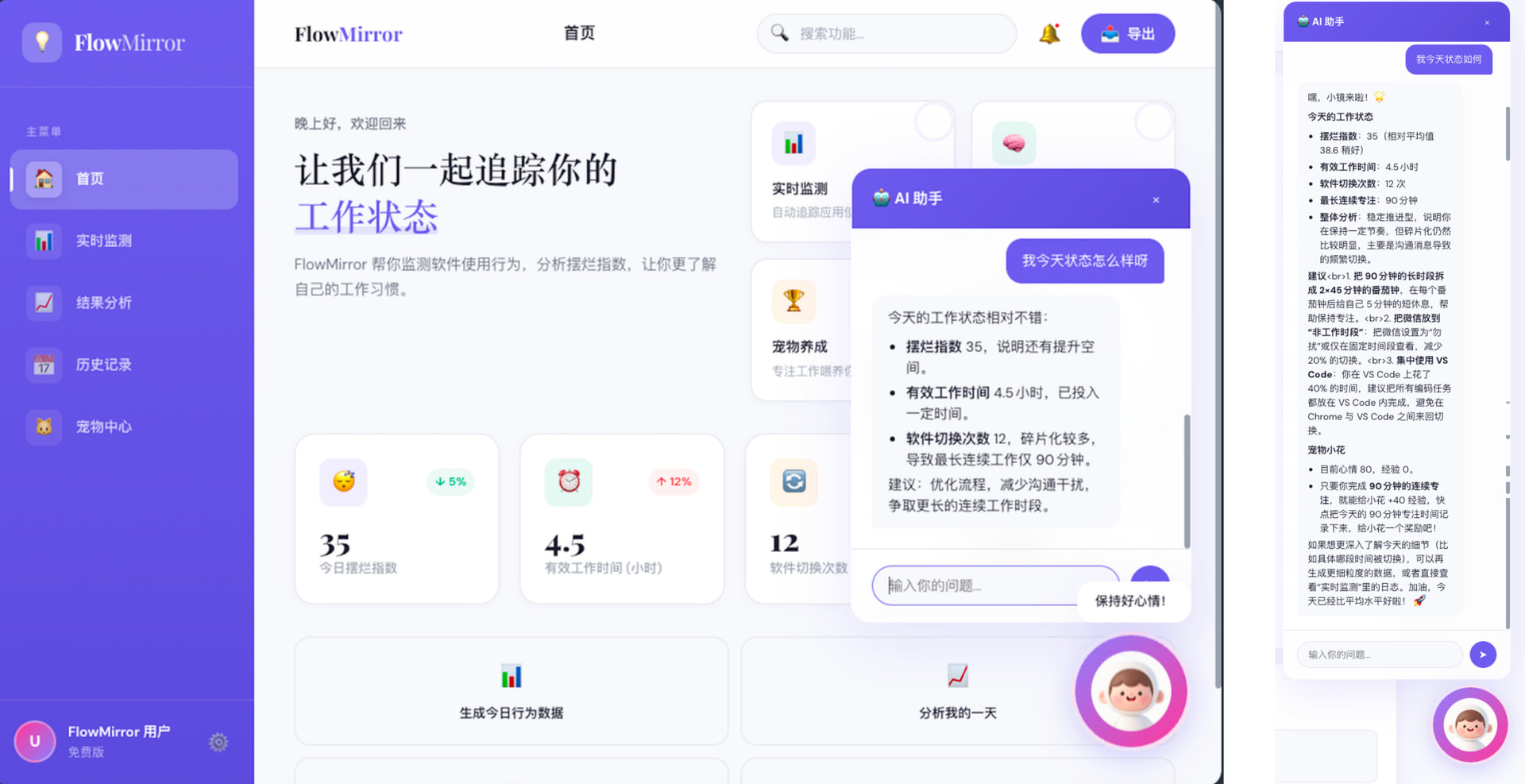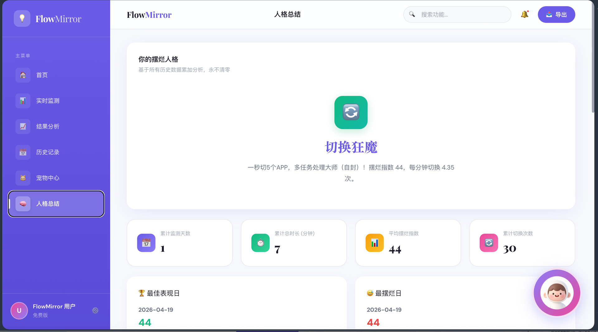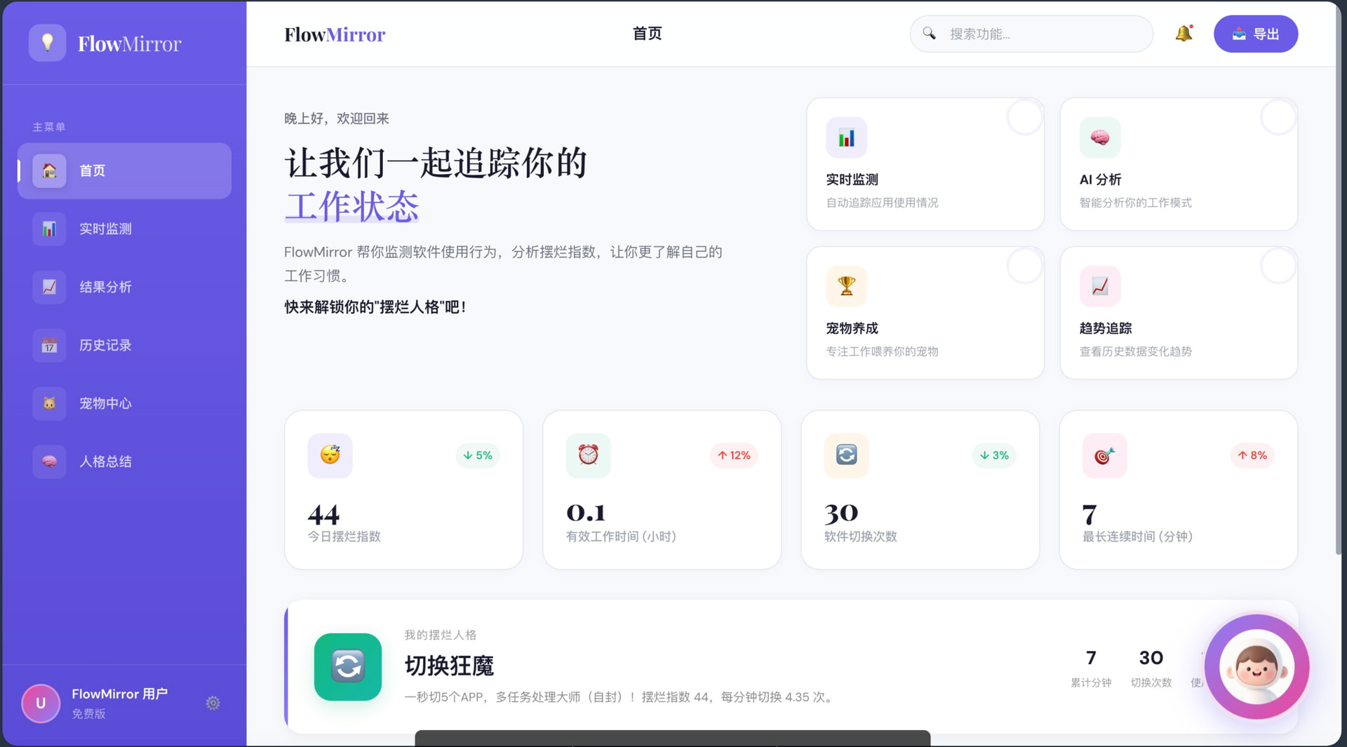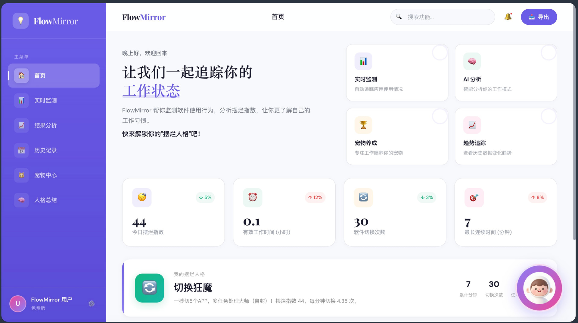 这是一个通过读取用户授权的软件使用行为、窗口切换频率与工作流轨迹,自动识别用户当天真实工作状态,并生成“摆烂指数”“行为标签”和“时间真相报告”的行为分析工具,为你创建你的“摆烂人格”,并以电子宠物及AI助手进行实时反馈与干预。