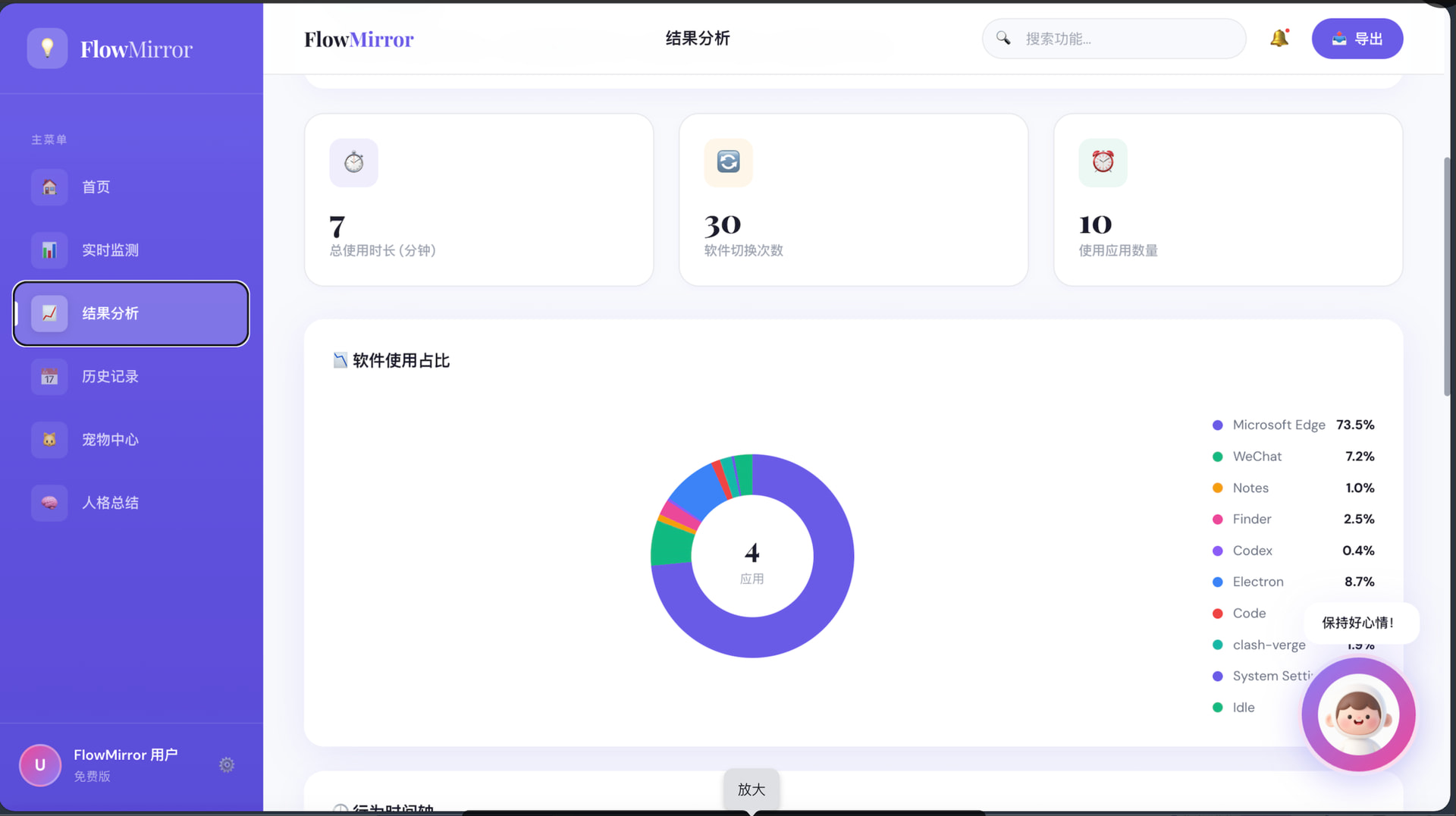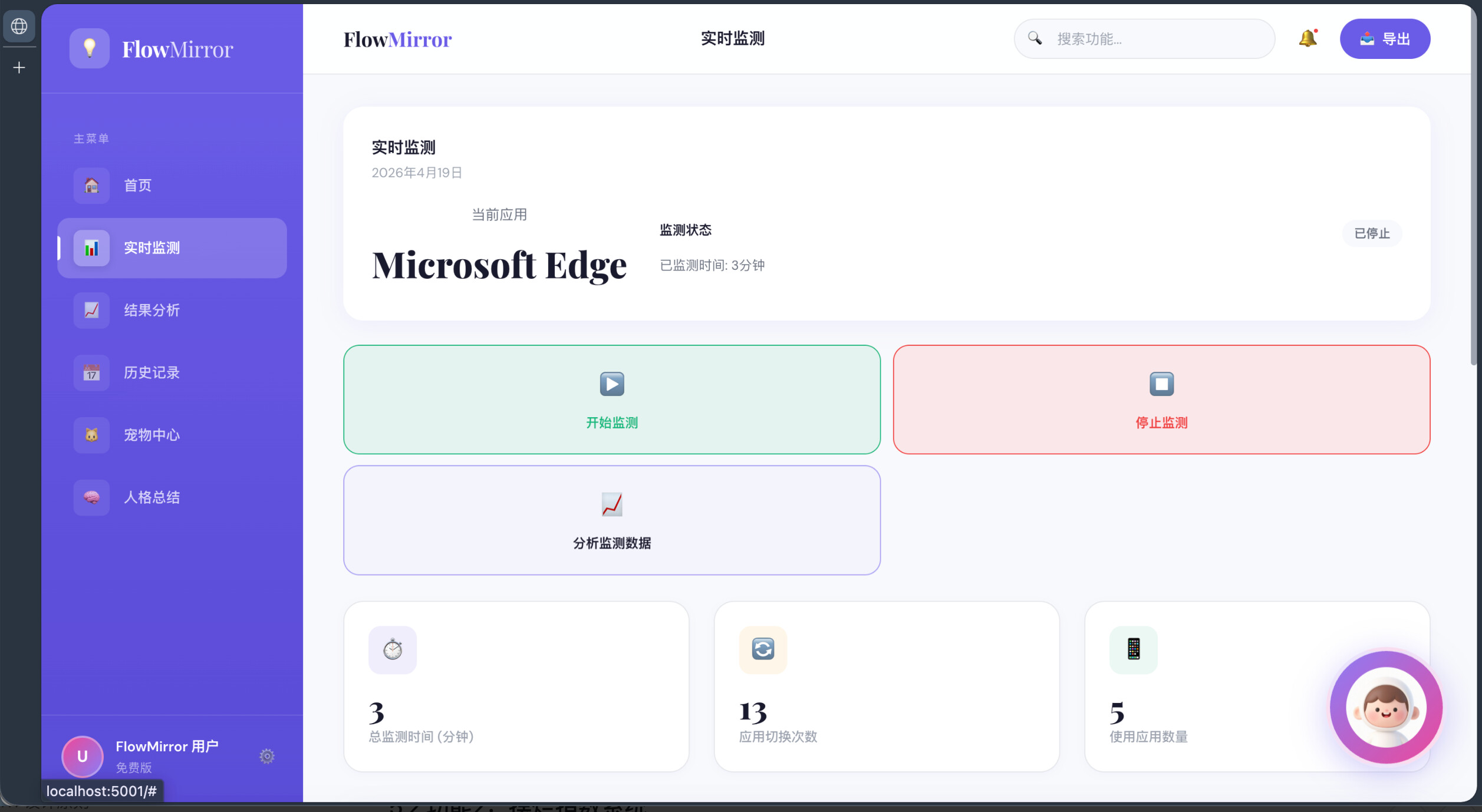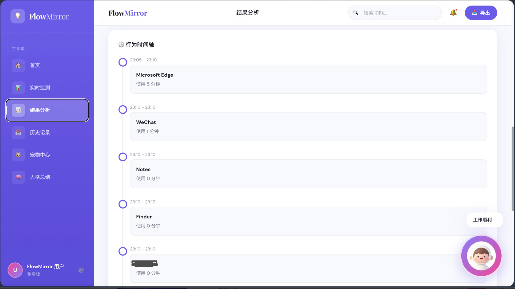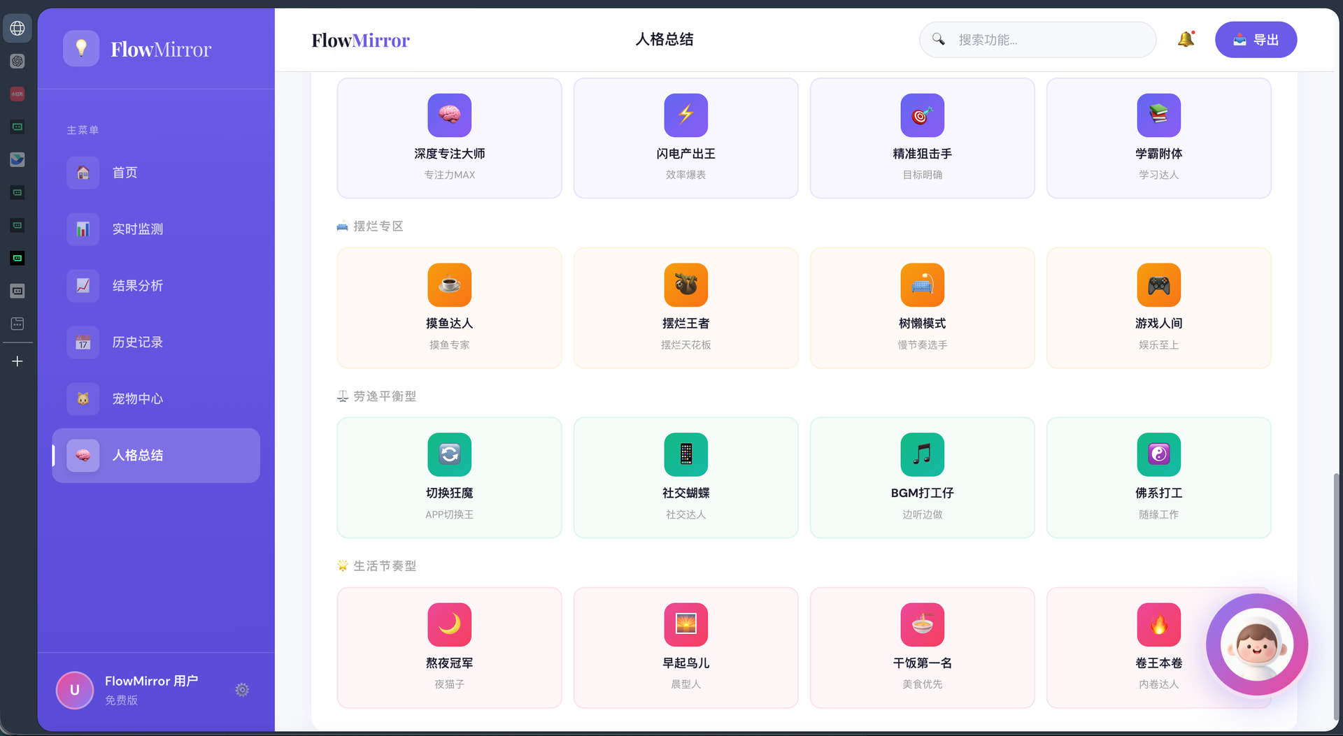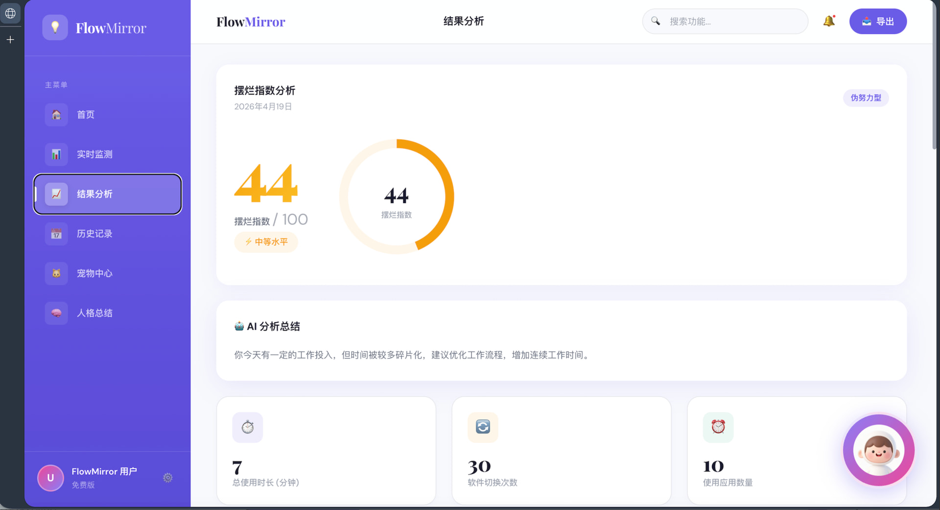 这是一个通过读取用户授权的软件使用行为、窗口切换频率与工作流轨迹,自动识别用户当天真实工作状态,并生成“摆烂指数”“行为标签”和“时间真相报告”的行为分析工具,为你创建你的“摆烂人格”,并以电子宠物及AI助手进行实时反馈与干预。