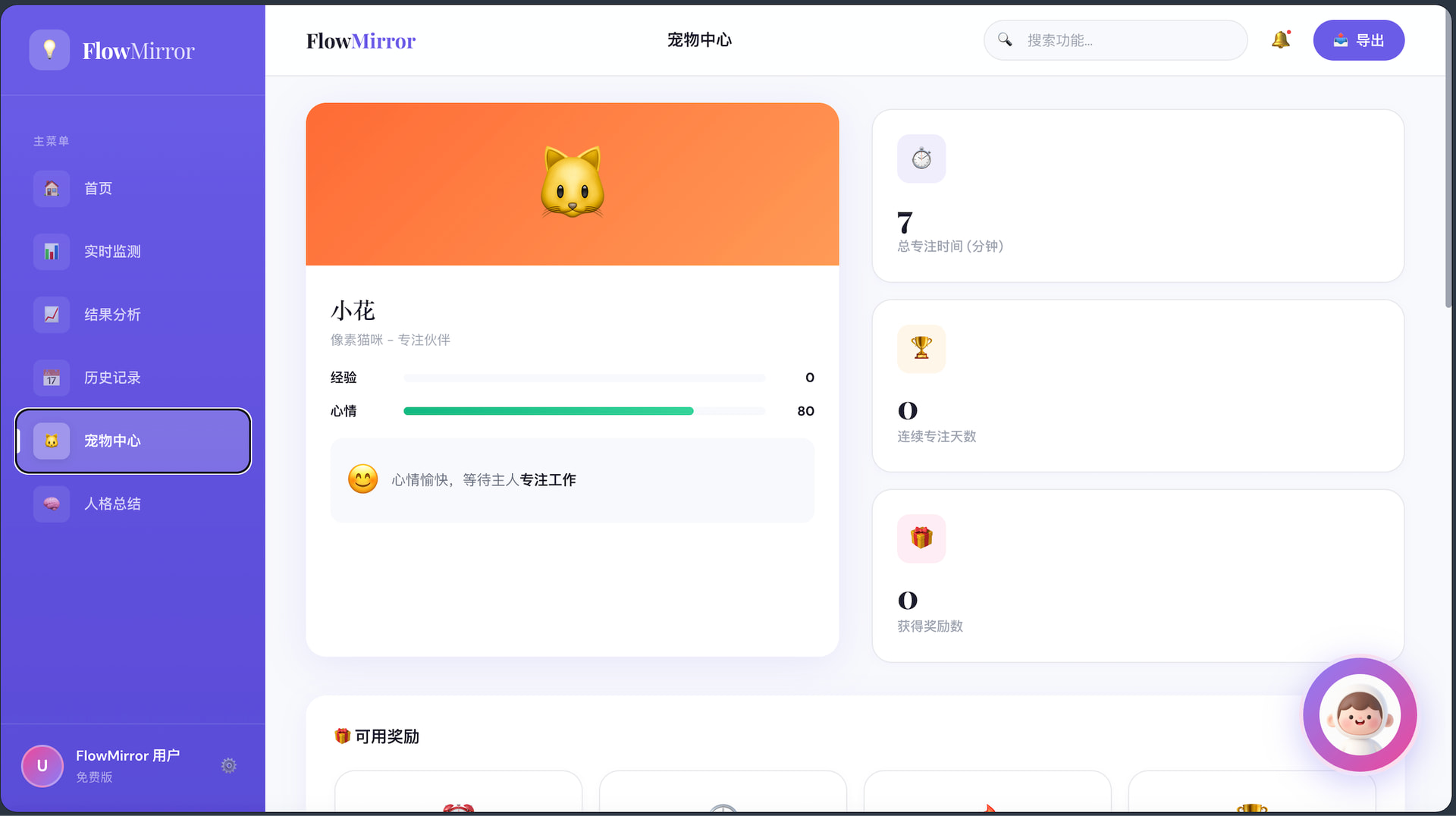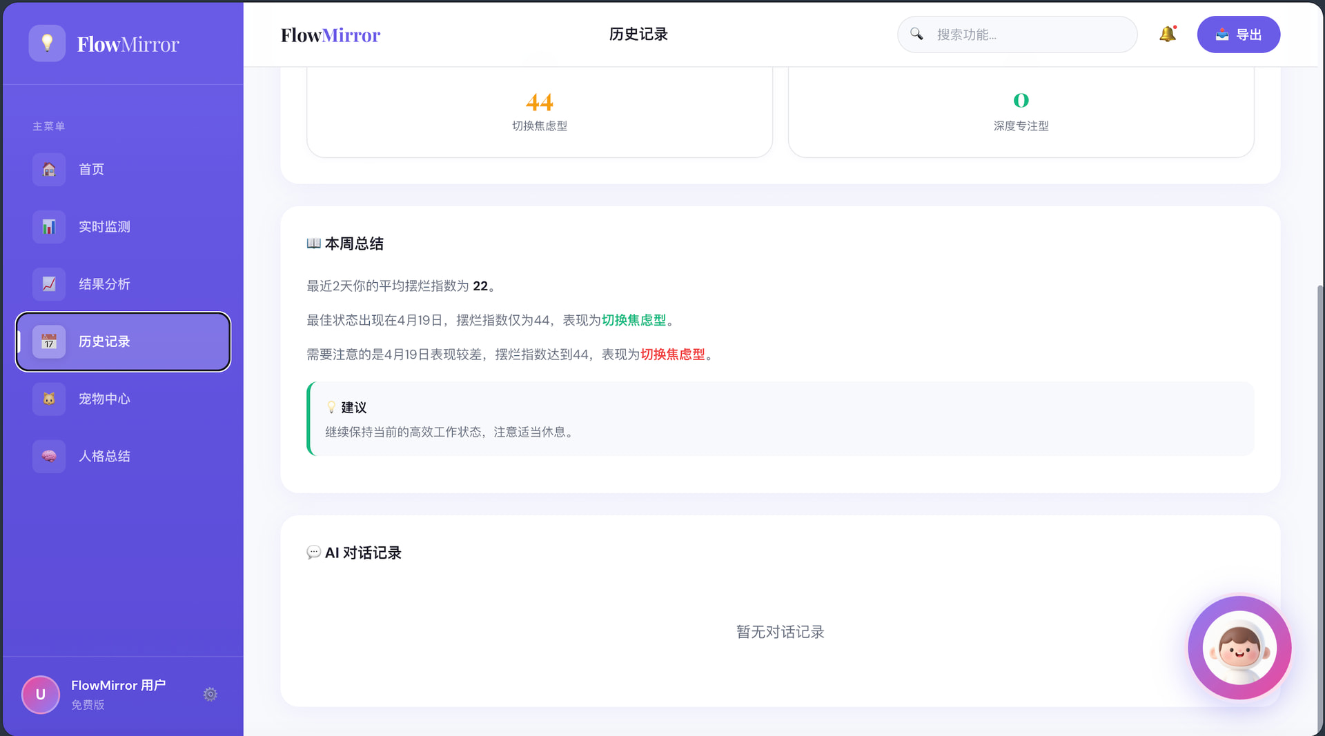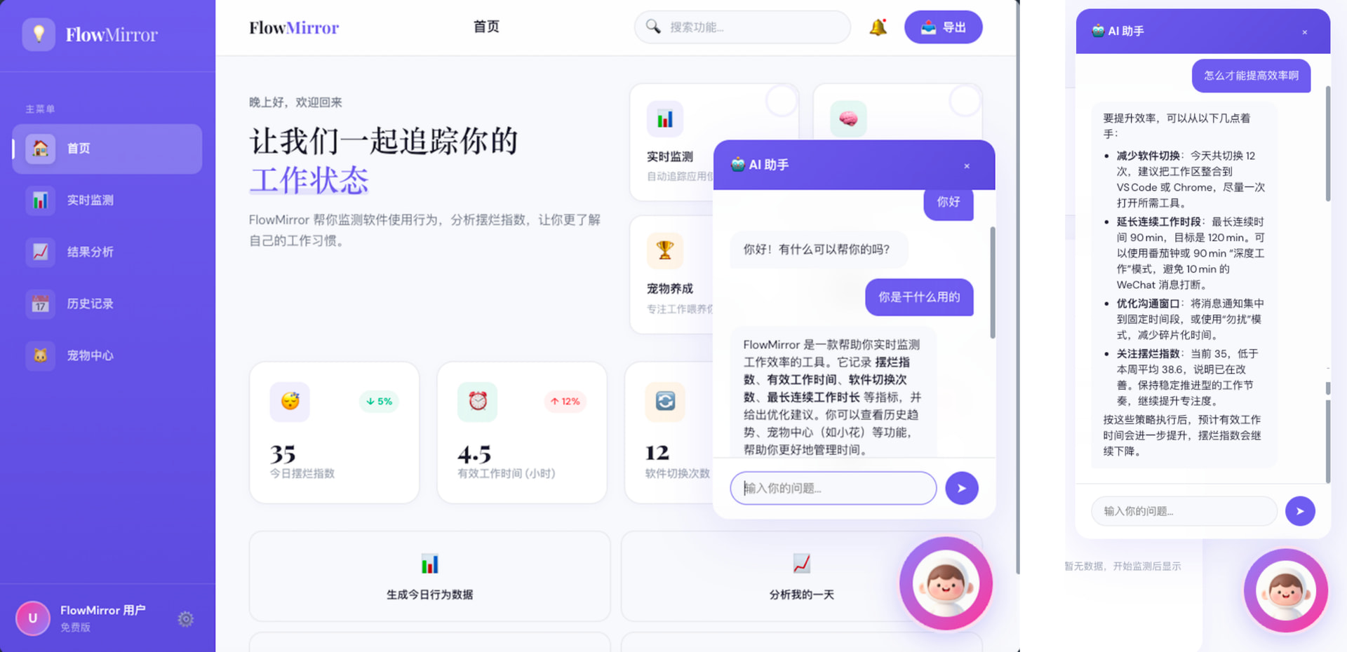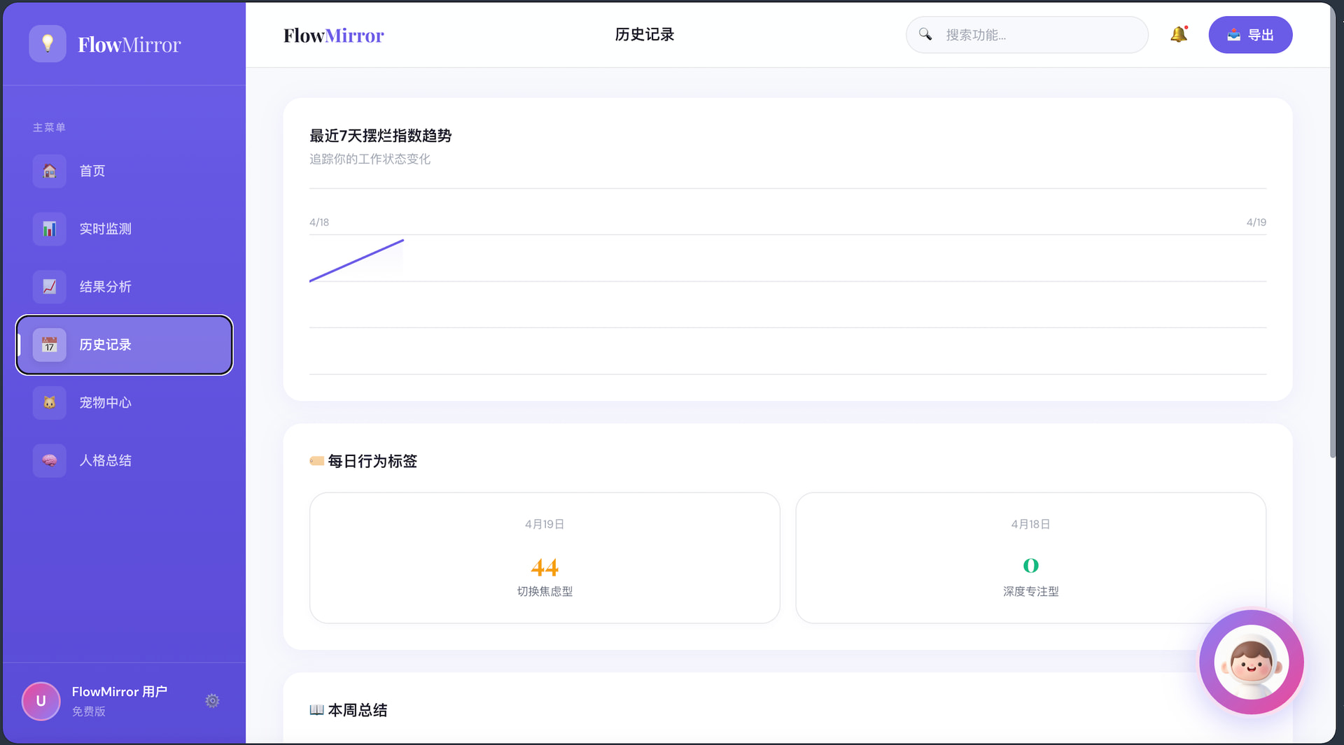 最后,FlowMirror是一款基于用户电脑行为感知的AI专注力管理产品,通过实时监测软件使用、窗口切换与输入行为,构建“行为识别—状态判断—指标量化—情绪反馈”的闭环系统。产品核心以“摆烂指数”为量化指标,结合AI像素宠物进行拟人化交互与实时干预,将抽象的效率问题转化为可感知、可反馈的用户体验,从而引导用户提升专注力、减少无效行为。系统兼具数据驱动与情绪化设计,融合行为分析算法与游戏化机制,具备明确的产品落地潜力与扩展空间。
