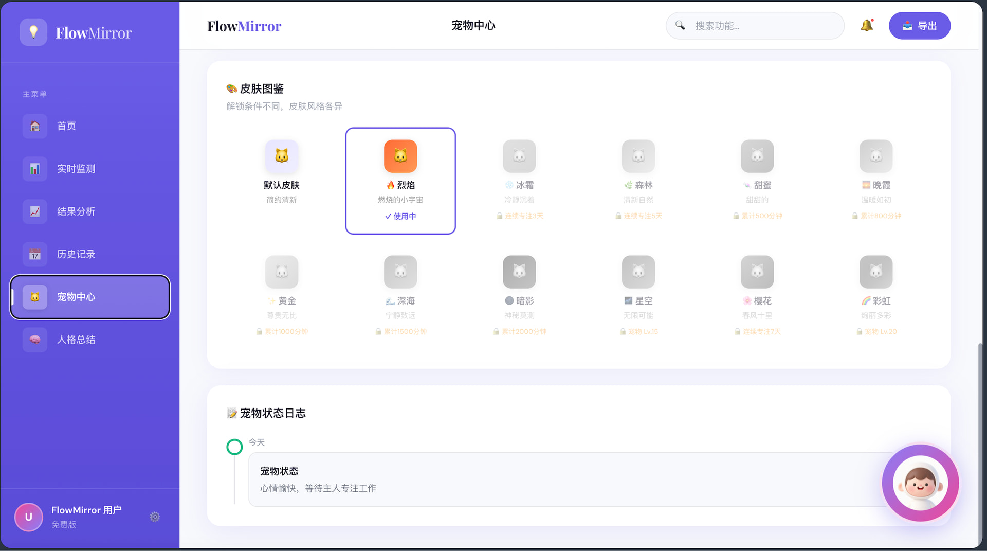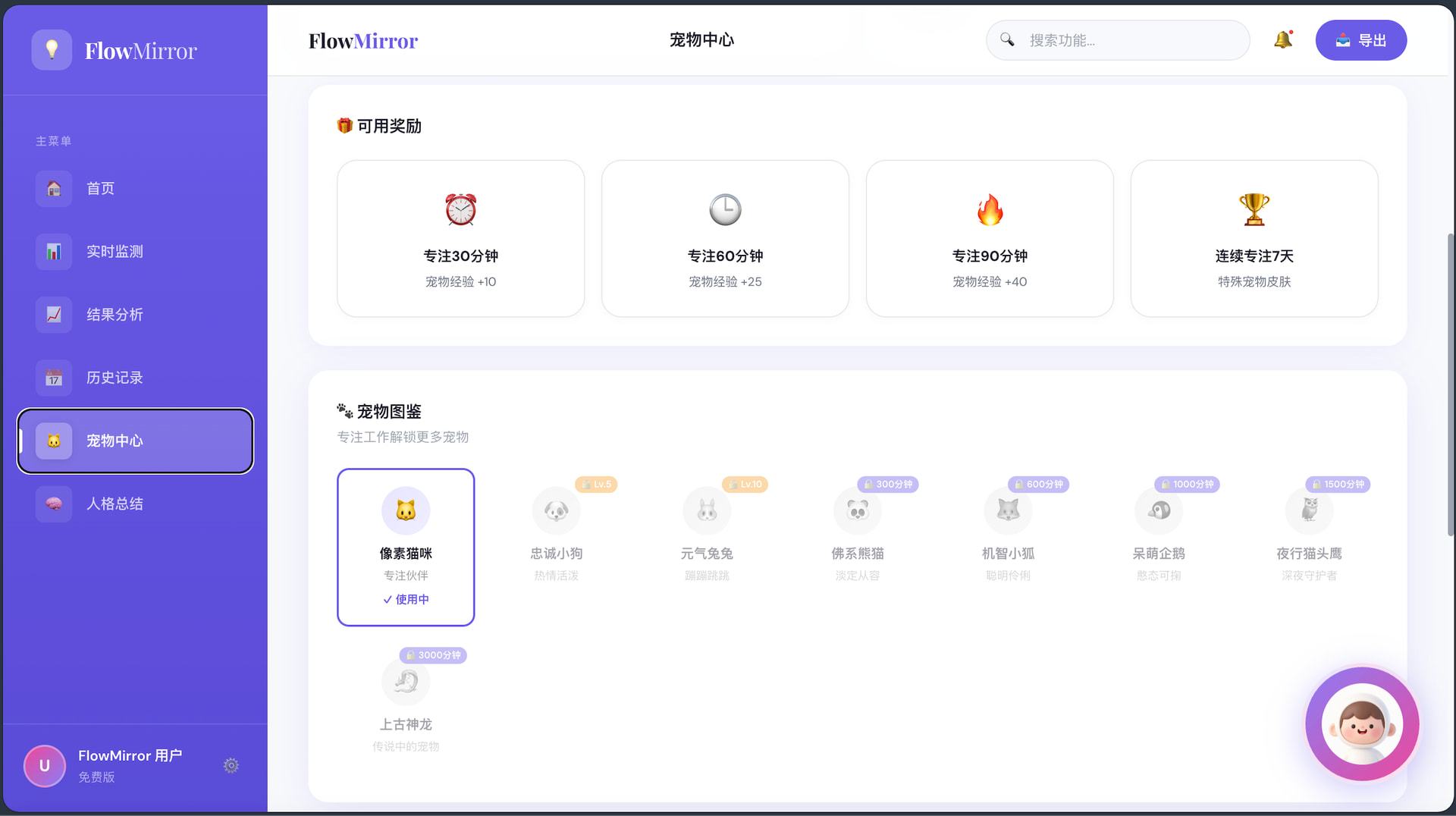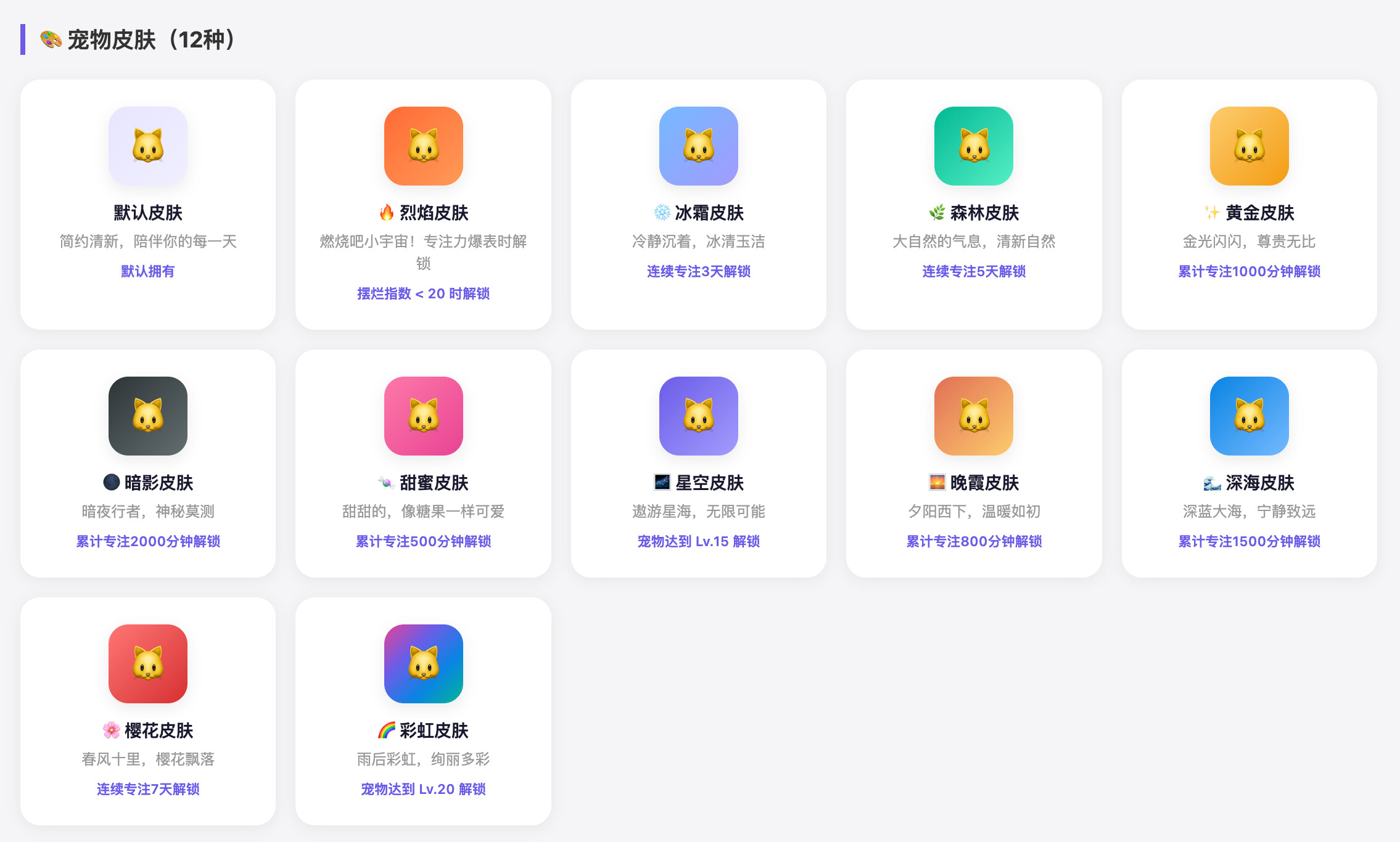 同时设计不同的宠物样式以及皮肤、背景等,在专注时长达到一定要求后解锁。