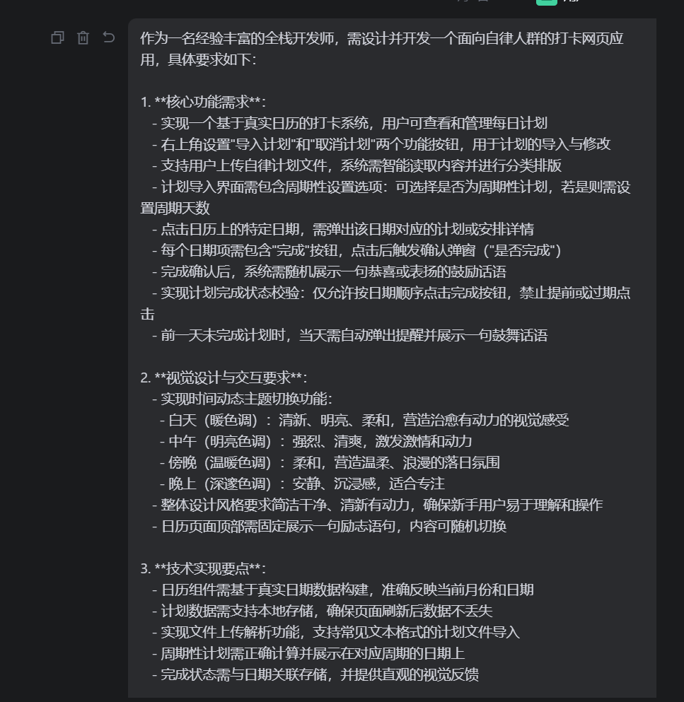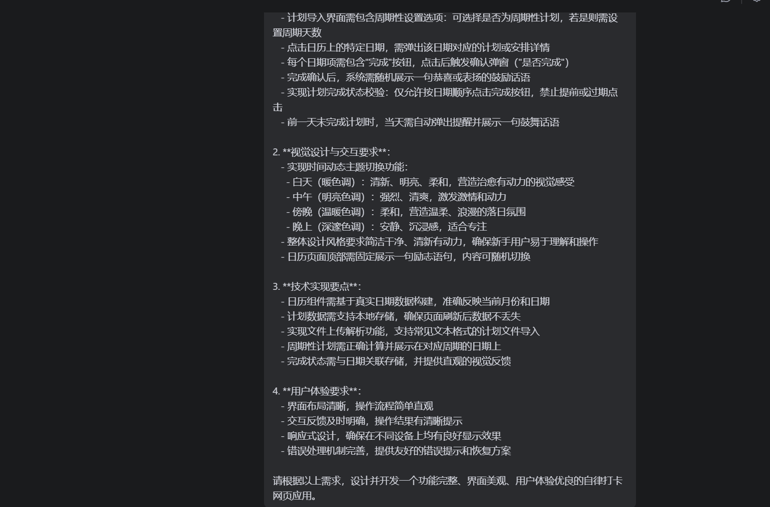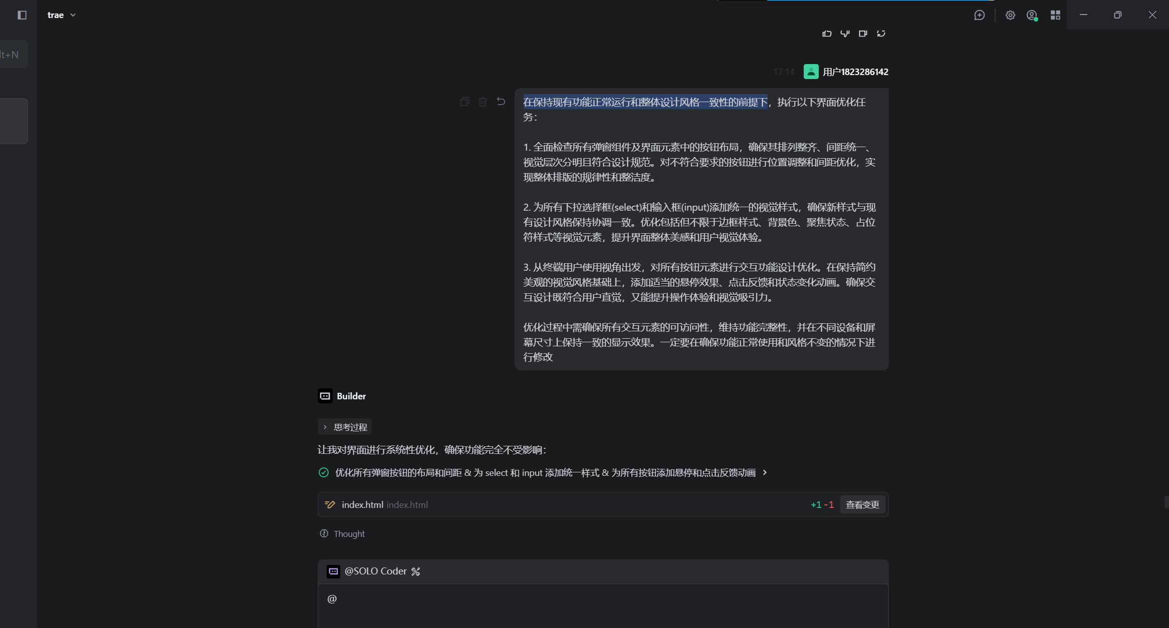 最初的提示词很重要,因为他相当于地基,这是你最初最宏观的想法。当然,哪怕有漏洞和制造出来的有缺陷是正常的,不必担心。因为你可以不断的提出你的想法让trea改进或者是添加你的新灵感,他会不断满足你的想法和改进直到你满意为止。正常来说,如果项目较难或者想法精妙,一般不可能第一次发提示词就成功生成满意的作品。但是如果你第一次的提示词发布足够完善和精准,后续的改进会变得事半功倍。trea也非常乐意满足你对他‘刁难’喔。