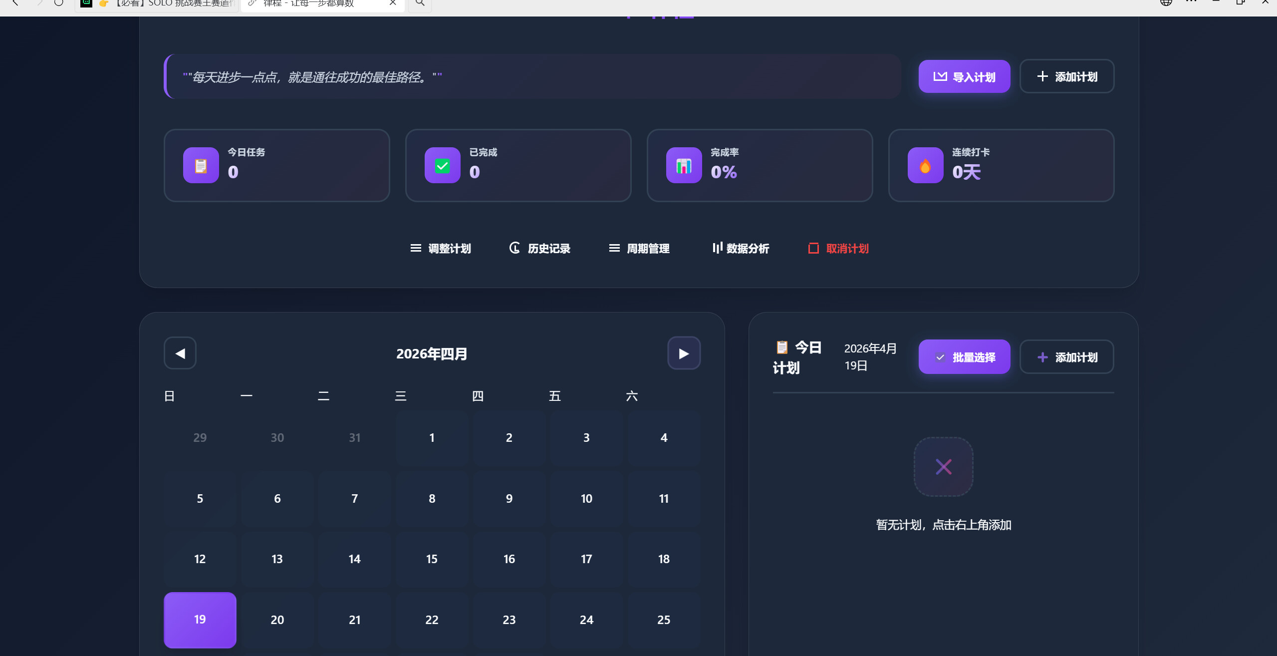 上面是我作品链接,相信各位一看就能看出来是做什么的。导入方式有智能导入和手动导入,智能导入能根据你上传的文档进行分析并帮你安排计划到日期中,有多种形式上传长期的循环的周期的都可以上传导入。并且有其他功能像”数据分析“等使用欢迎各位体验,功能丰富并且便于使用。页面风格以简约为使用起来会比较主清晰明了,颜色风格形式会根据时间的变化发生改变,有白天中午傍晚夜晚四种样式随着时间变化而改变。希望我的作品对各位也能有所帮助,愿与各位一同坚持,一同努力。若是在使用过程中有发现漏洞和改进建议欢迎留言,谢谢