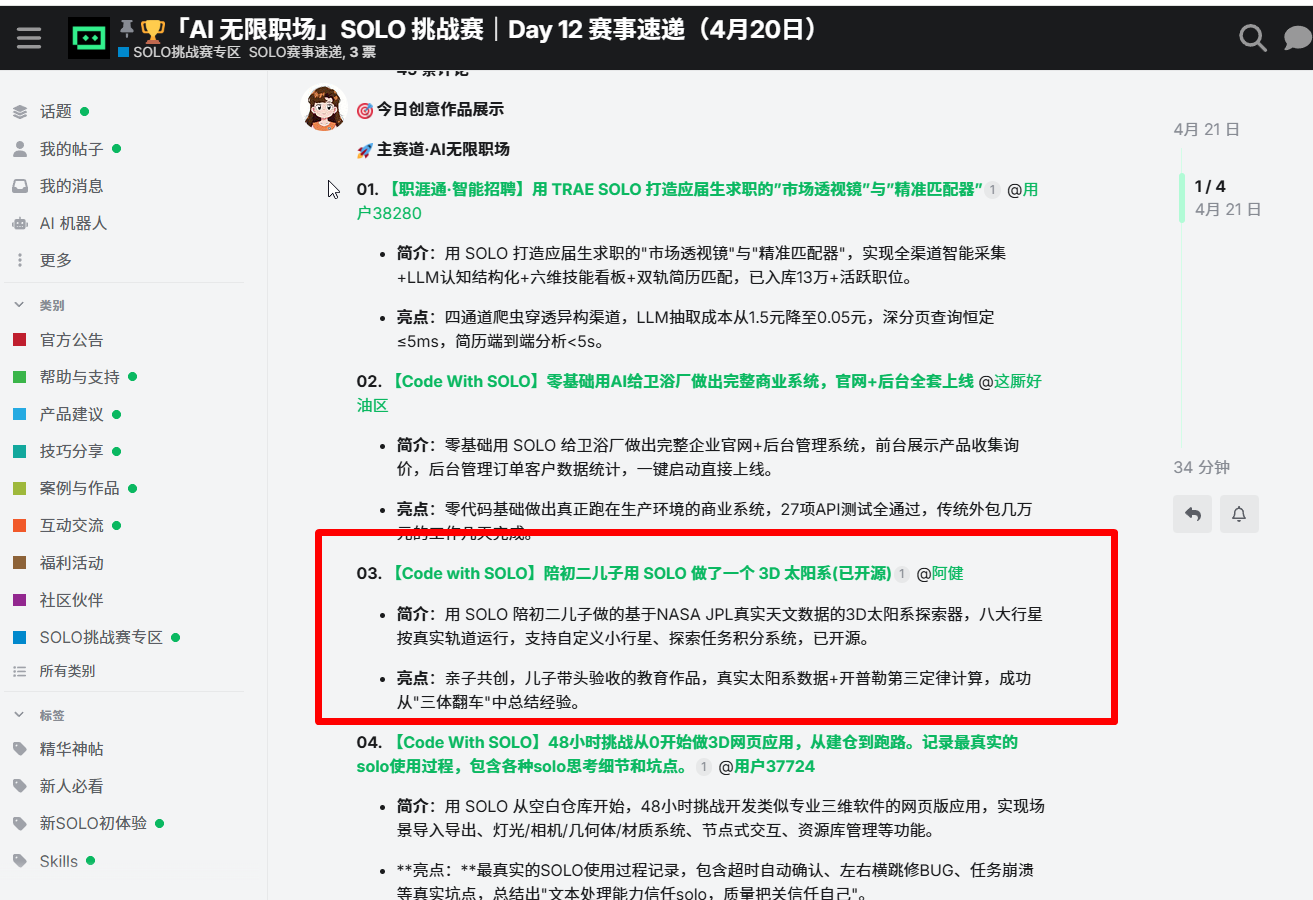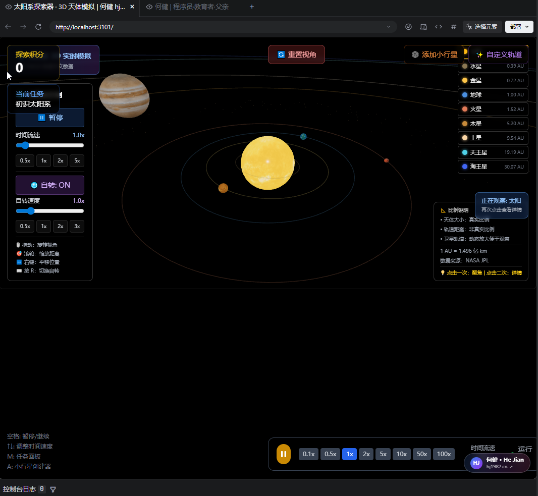 儿子把这话当了真,回家第一句话就是:"爸爸,这个能做吗?"于是拉着一个多年没写过代码的 IT 爸爸和 SOLO,三个周末做出了一个基于真实 NASA JPL 天文数据的 3D 太阳系探索器:八大行星按真实轨道运行、主要卫星全覆盖、还能自己画一颗小行星扔进太阳系(开普勒第三定律真·算出公转周期)。