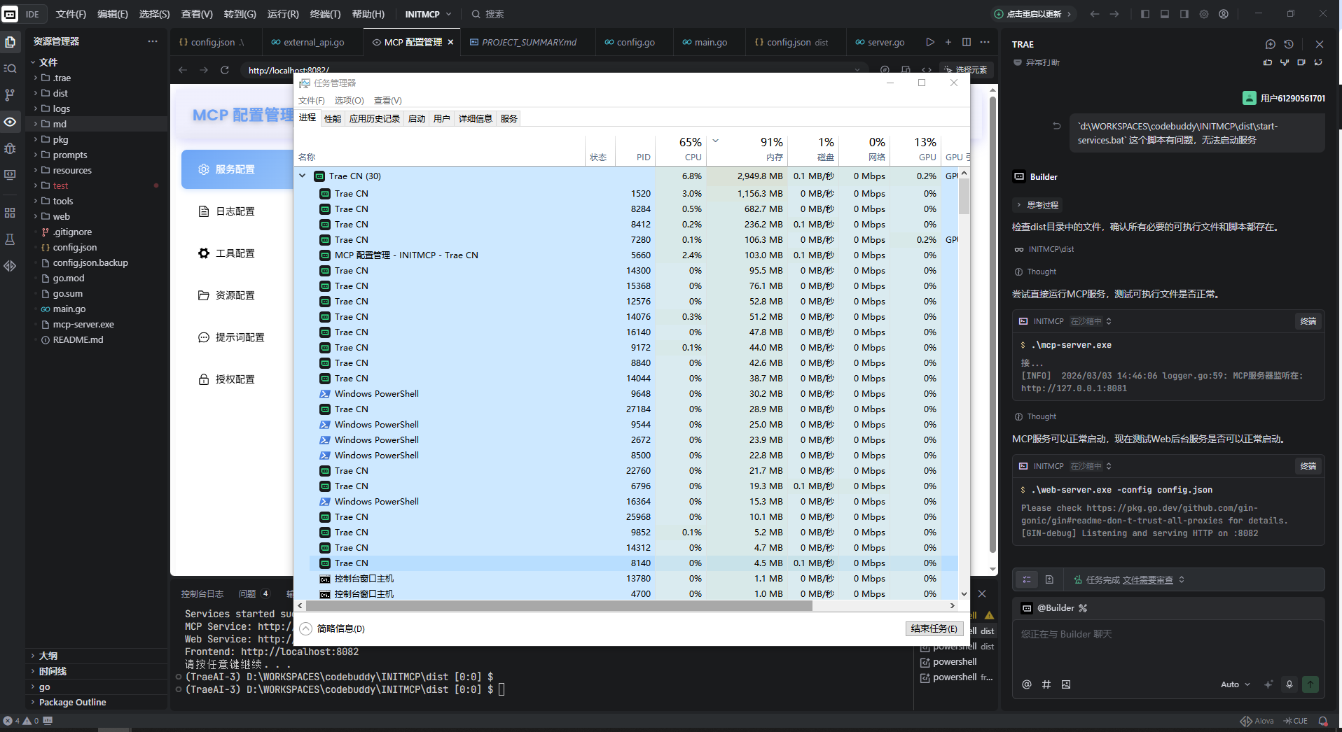 工程不复杂,代码量也不多,但是最低时3G内存的使用,最高时4个多G内存使用,有时候它干活干到一半就异常停止了,也不知道是内存或cpu占用太高导致,还是网路问题,或者是远端模型的问题,性能和稳定性还需要继续优化优化