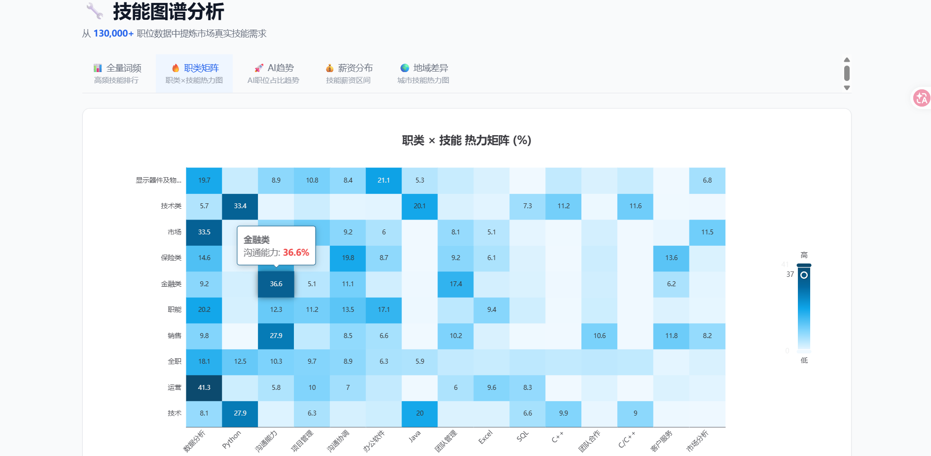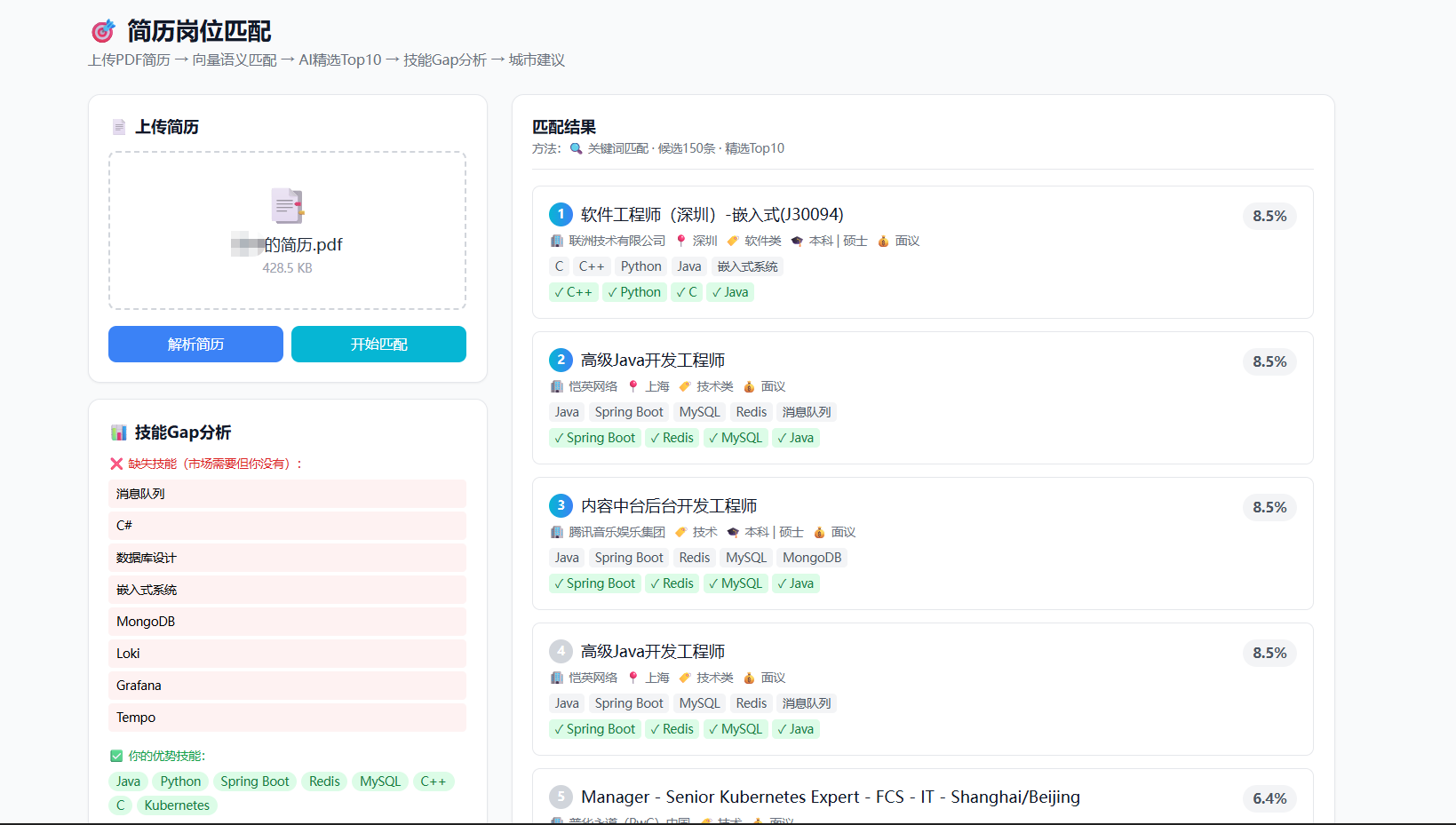 典型功能产出示例:用户上传 PDF 简历后,系统返回类似 {topMatches: [{title:"NLP算法工程师", city:"上海", matchScore:80.0, matchedSkills:["Python","PyTorch","NLP","深度学习"]}], aiAnalysis:{skillGaps:[{skill:"Transformer",demandCount:8}, {skill:"Kubernetes",demandCount:6}], citySuggestions:[{city:"北京",matchCount:5}]}} 的结构化报告,前端以雷达图 + 条形图 + 技能共现网络图可视化呈现。