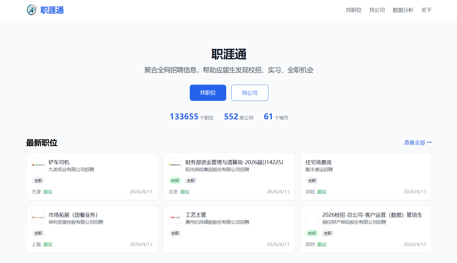 职涯通是一个 Web 端智能招聘聚合与分析平台(Next.js 14 前端 + FastAPI 后端 + MySQL/Redis/FAISS 存储),核心功能分为四块: