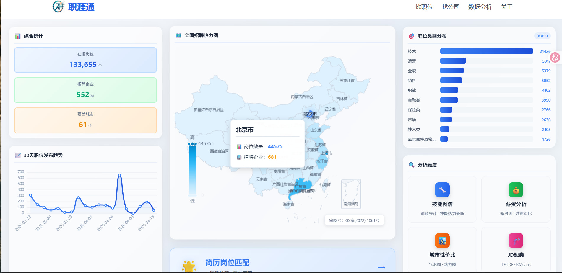 数据规模:原始 CSV 约 309MB,ETL 后入库有效活跃职位 13 万+ 条,覆盖 500+ 企业独立招聘渠道,单条记录含 45 个结构化字段(含 384 维语义向量)。