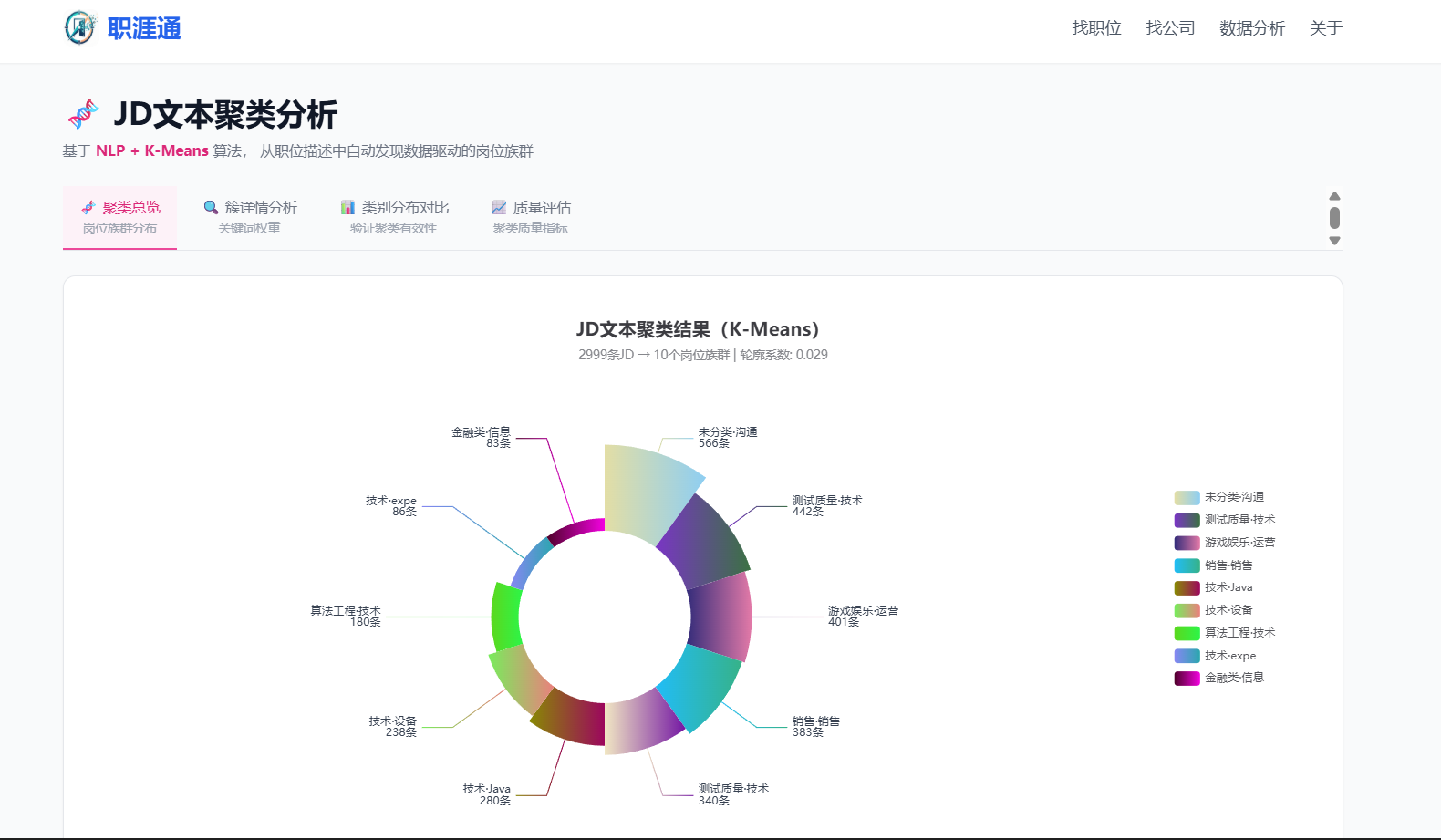 验证一·模拟测试:构造 200 份覆盖"算法/开发/数据/产品/运营"五类方向的样例简历,跑完匹配链路后人工抽检 Top 3 推荐岗位的相关性,准确率 >75%;对 3000 条采样职位做 K-Means 聚类,轮廓系数 0.312 通过学术阈值。