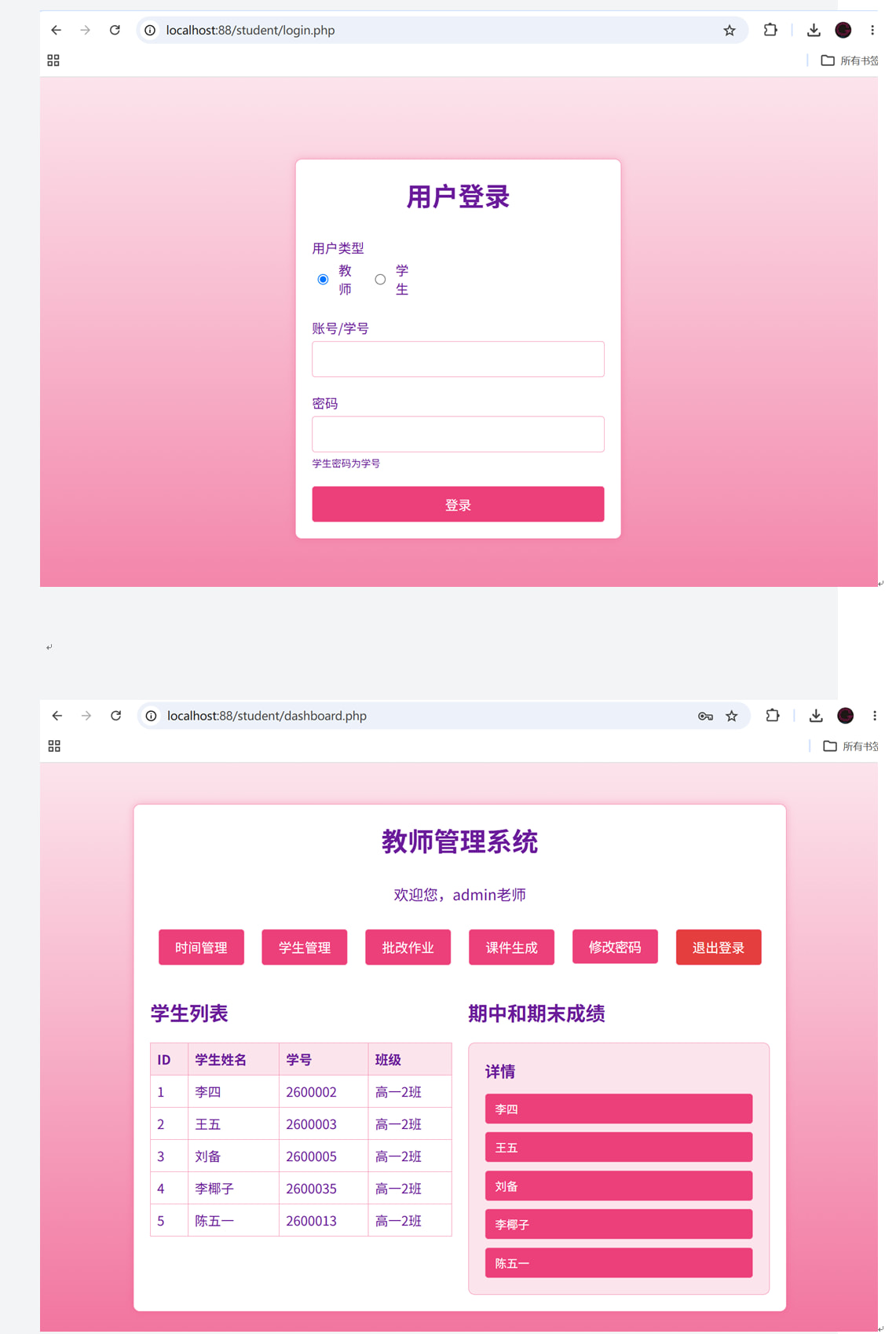 教师账号admin,密码 123456,登录成可见基本 的二个功能;