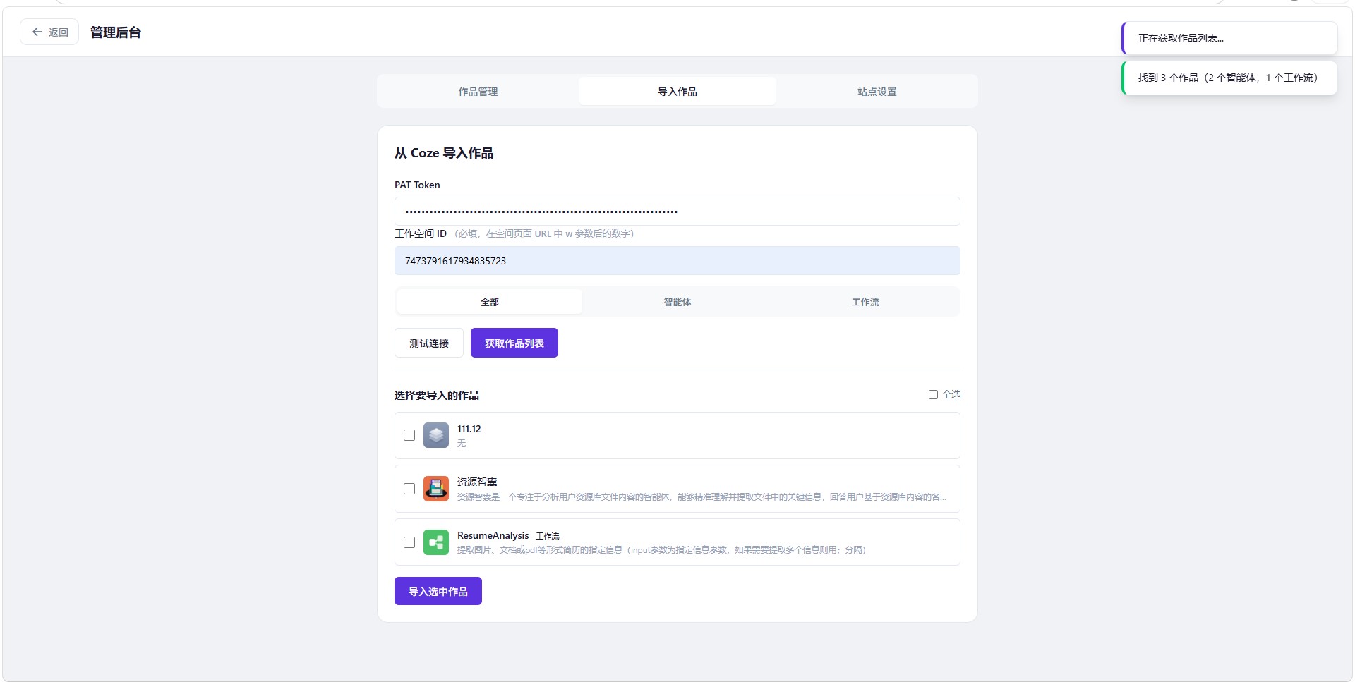 在管理后台的"导入作品"页面,只需输入扣子智能体的 Bot ID 和 PAT Token,系统就会自动拉取智能体的名称、描述、开场白、建议问题等配置信息,并自动生成对应的前端展示页面。