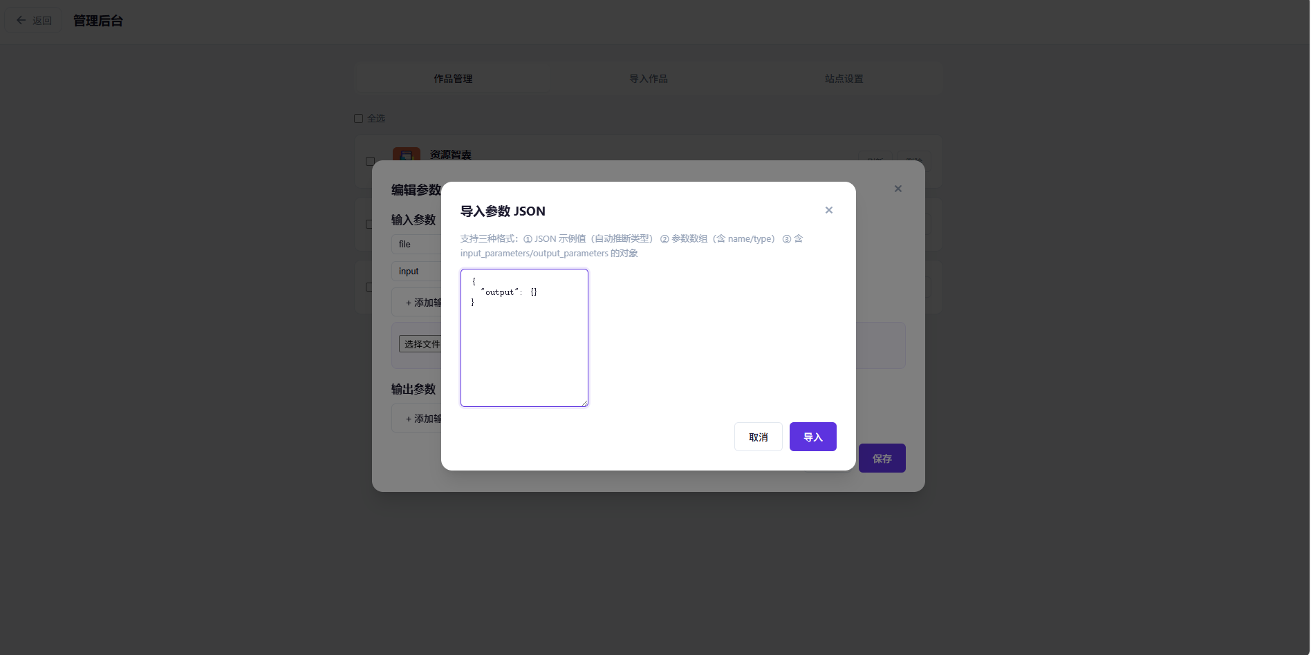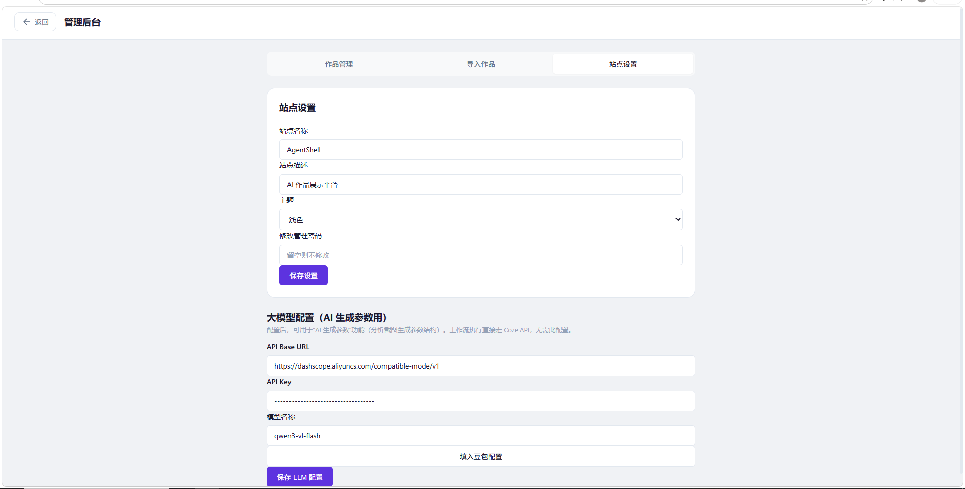 管理后台提供了完整的作品管理功能,包括作品列表、导入、编辑参数、站点设置等。