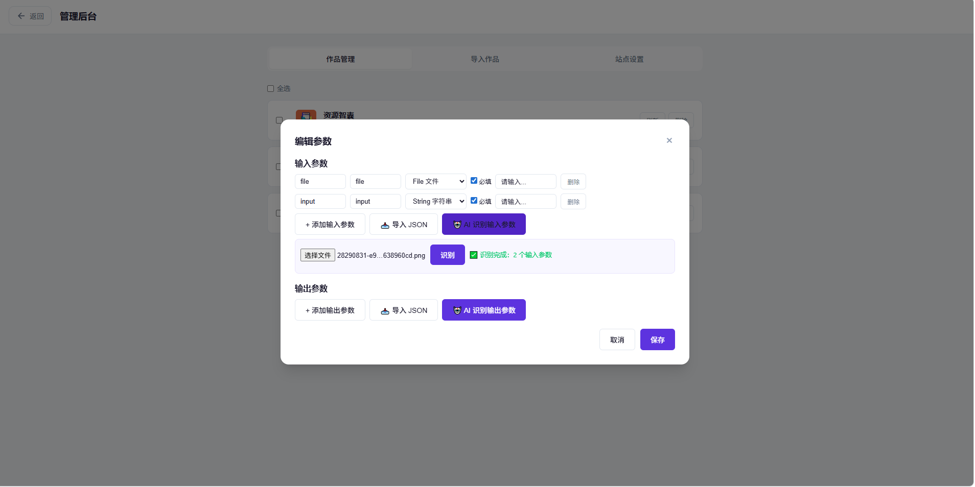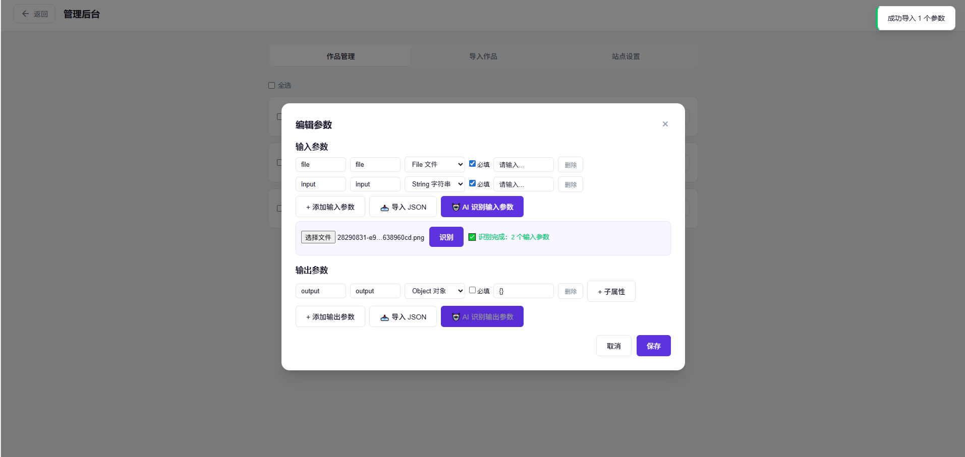 这是我觉得最有意思的功能之一。在配置工作流参数时,可以上传一张截图或文档,系统会调用 AI 自动识别其中的输入/输出参数结构,包括参数名称、类型、是否必填等信息,完全不需要手动填写。