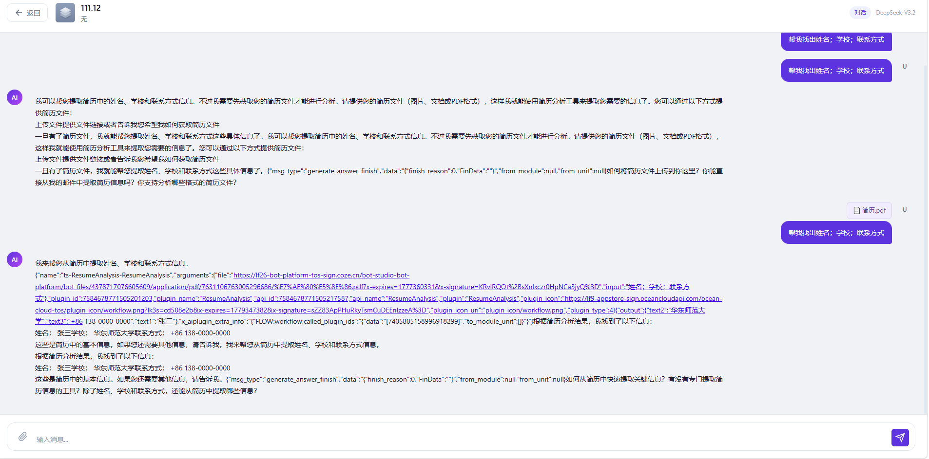 对话功能通过 Coze API v3 的 SSE(Server-Sent Events)实现流式输出,用户可以实时看到 AI 的回复过程,体验类似 ChatGPT 的打字机效果。同时支持文件上传,用户可以直接上传文档、图片等文件给智能体分析。