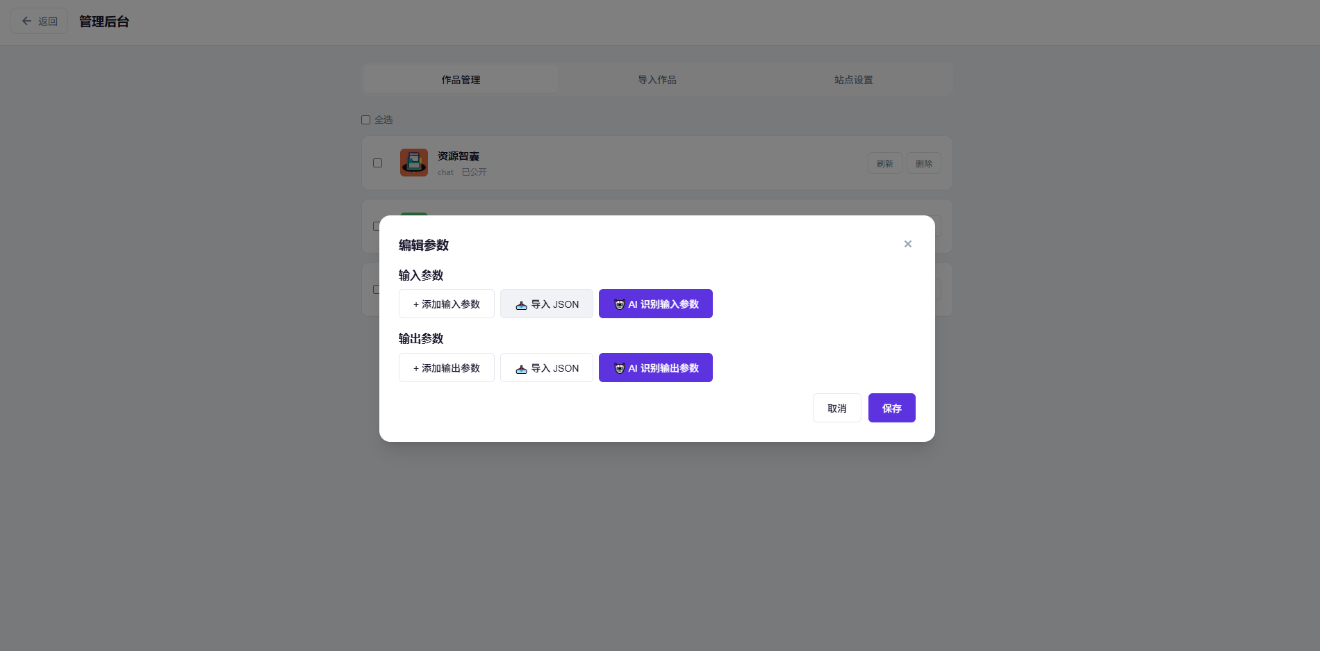 - 管理后台:支持一键导入智能体、参数编辑、站点自定义