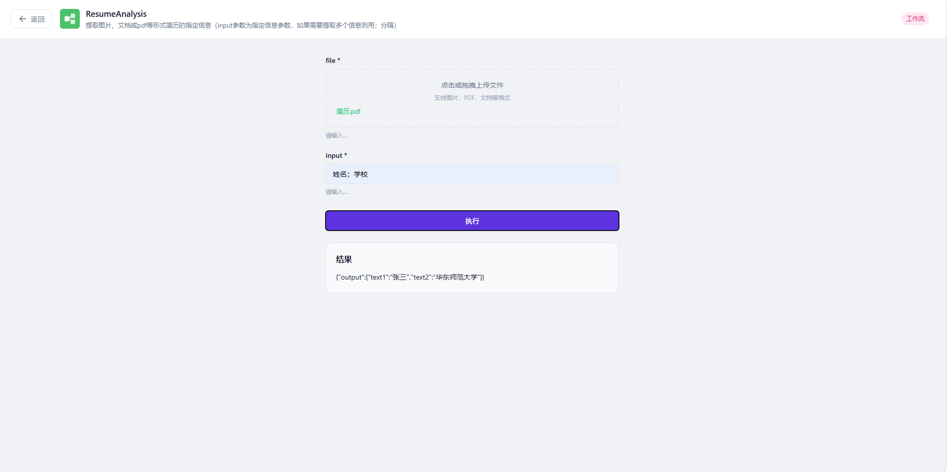 对于工作流类型的智能体,系统会自动生成参数表单。用户填写参数后点击执行,即可获取工作流的运行结果。还支持"智能体 + 工作流"的混合模式,在同一页面中既可以与智能体对话,也可以执行工作流。