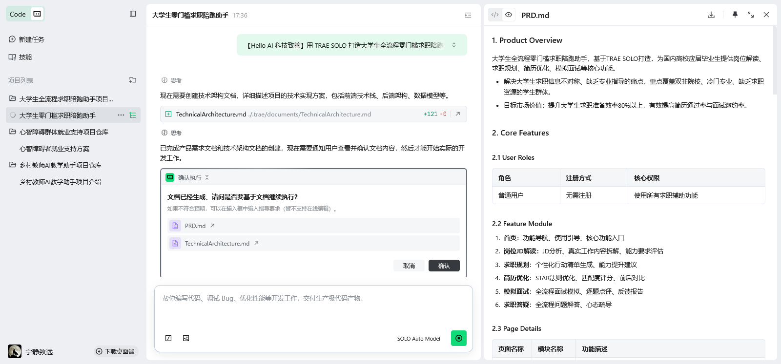 本作品是完全基于 TRAE SOLO 搭建的大学生全流程求职陪跑智能对话助手,属于轻量化、零门槛网页交互工具,无需下载安装、无需付费、无需编程基础,手机 / 电脑端打开 TRAE SOLO 即可使用,专为大学生求职全流程痛点量身打造,100% 贴合公益赛道命题三的核心要求。