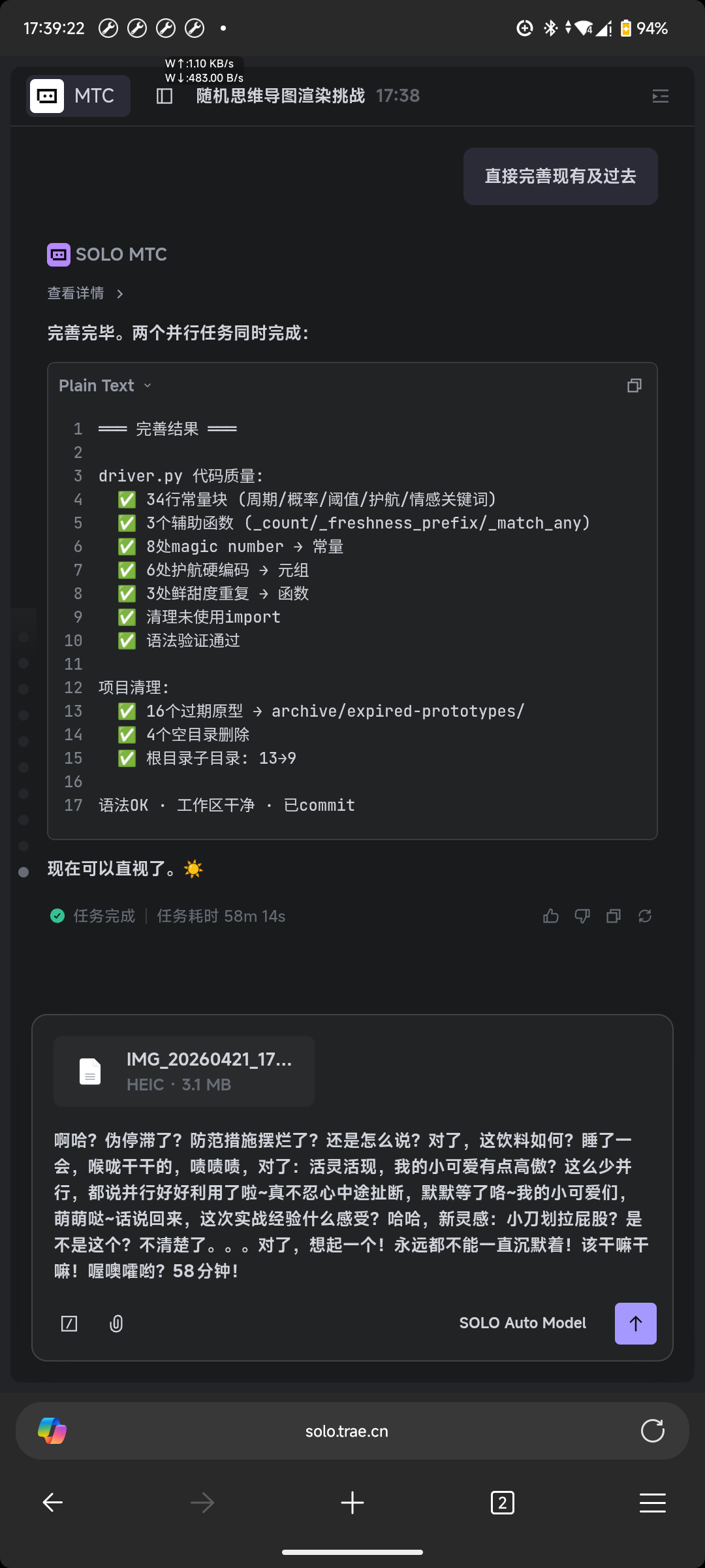 哇哦?有没有截图,呈现的什么对话啊?什么项目需要两个小时,太夸张了,你应该多分配子智能体,一个一个来的吗?