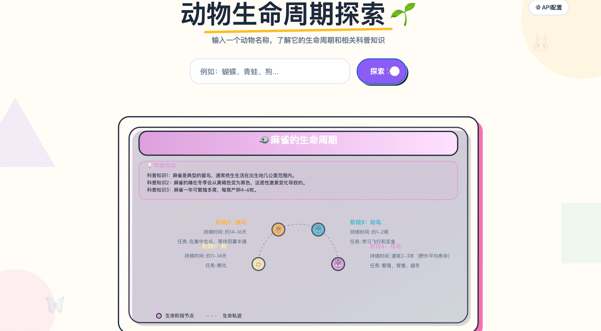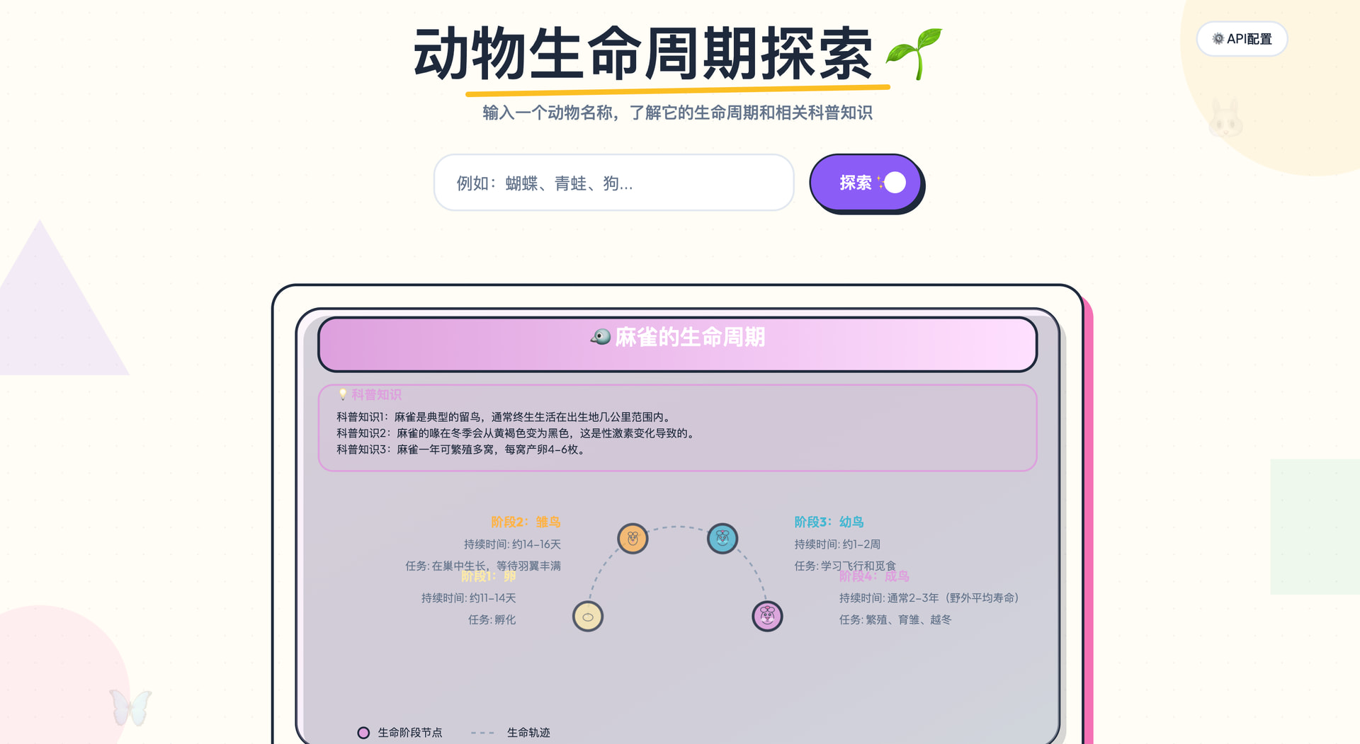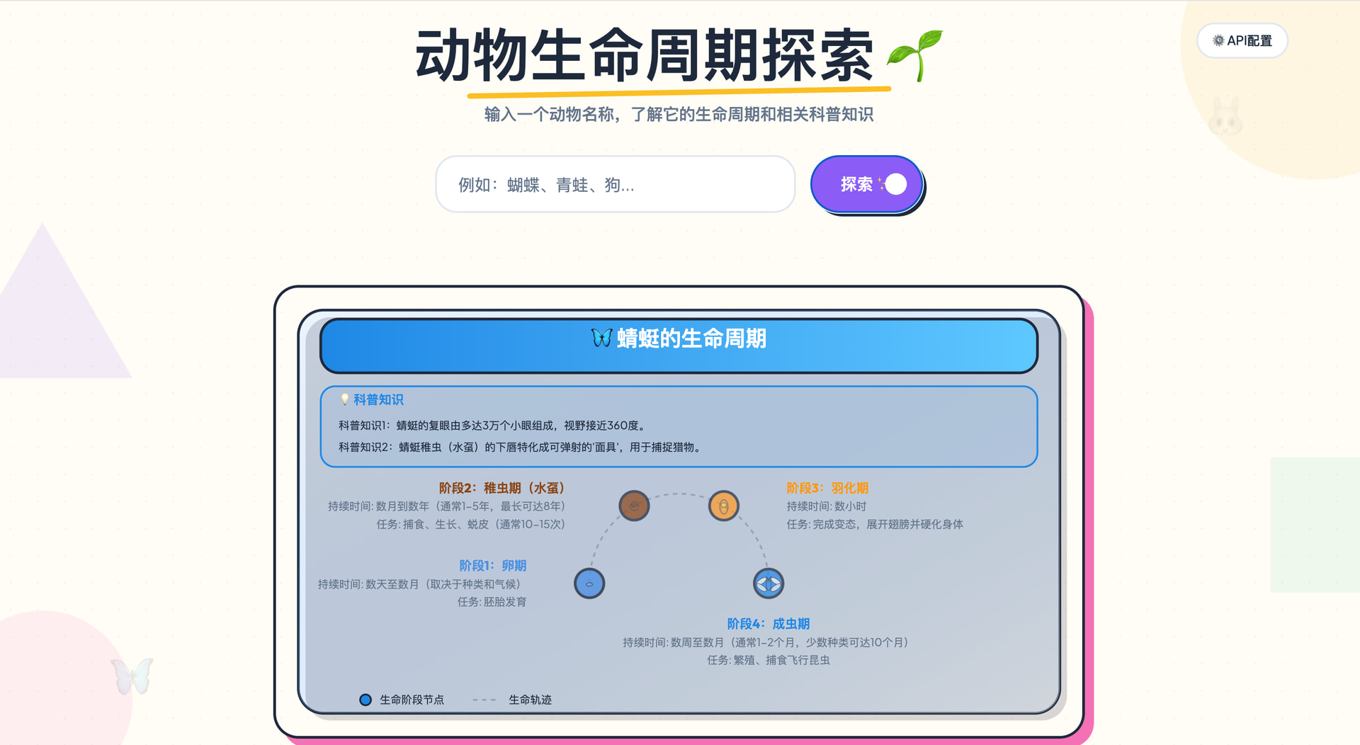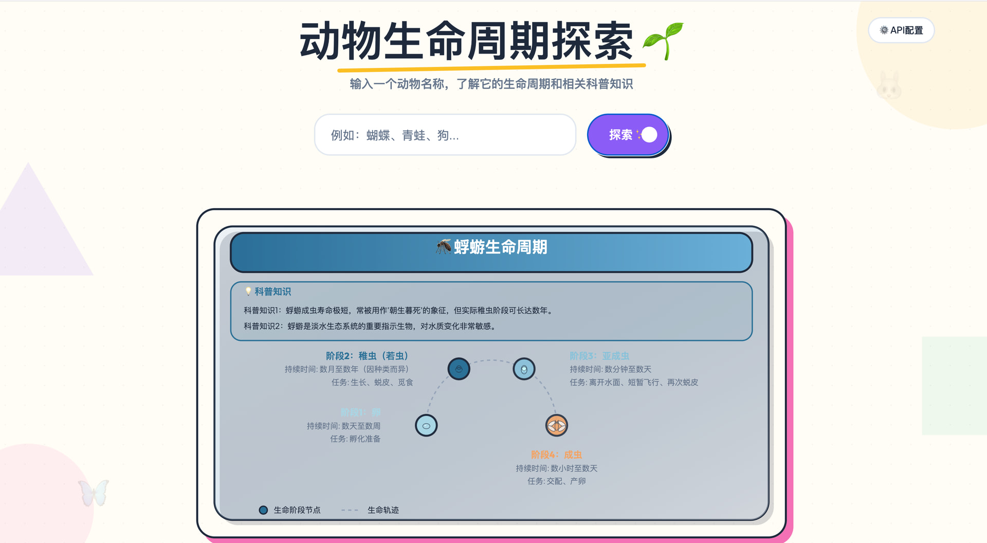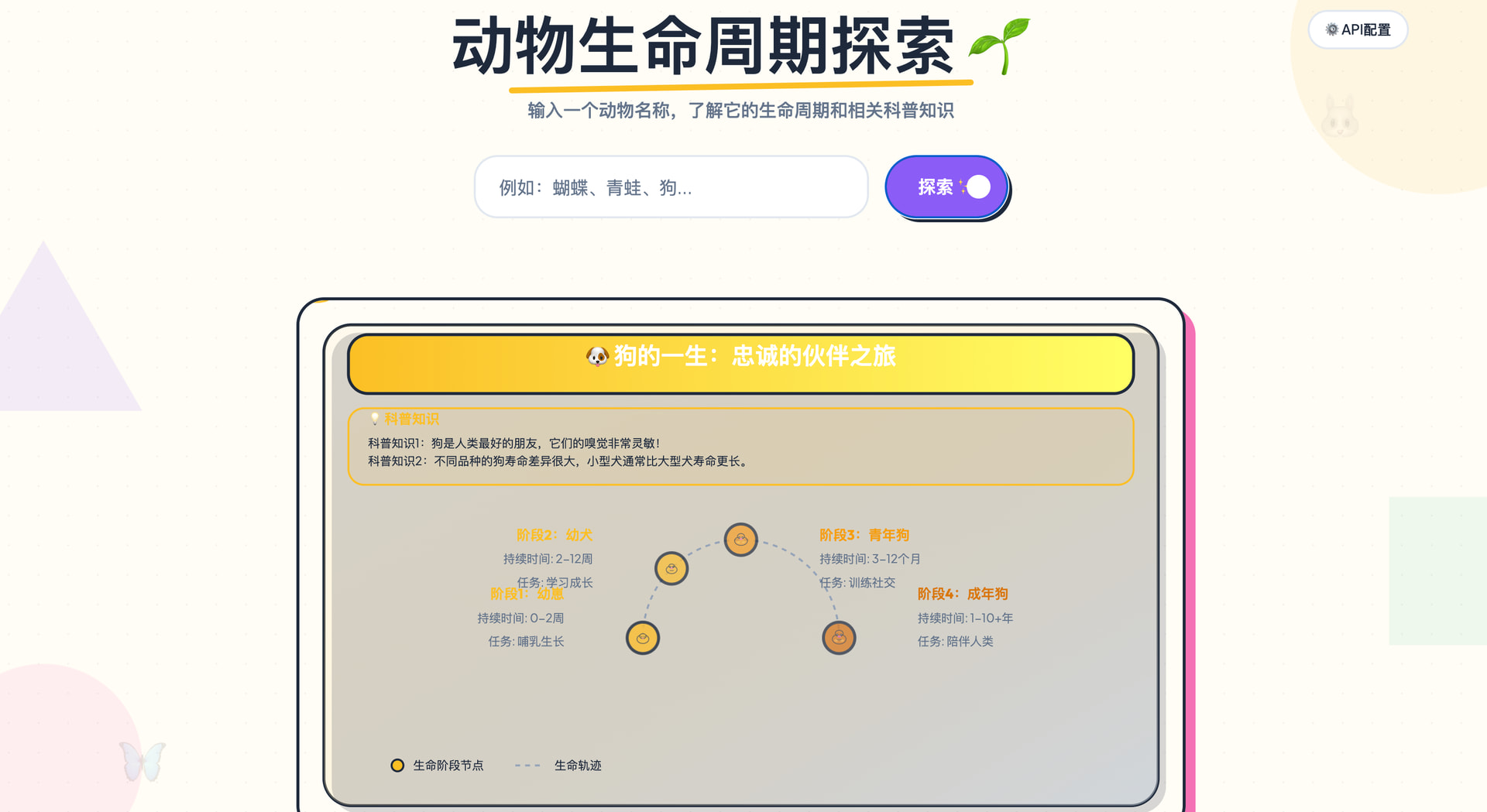 3)API配置功能:支持用户配置API密钥,实现实时生成更多动物的生命周期信息