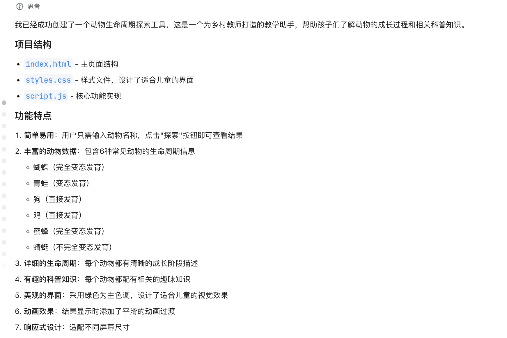 为乡村教师打造的动物科学教学小工具,通过可视化的方式展示动物生命周期,让抽象的科学知识变得生动易懂。目前已完成开发并在本地测试验证,界面友好直观,能够有效帮助教师进行动物科学教学。