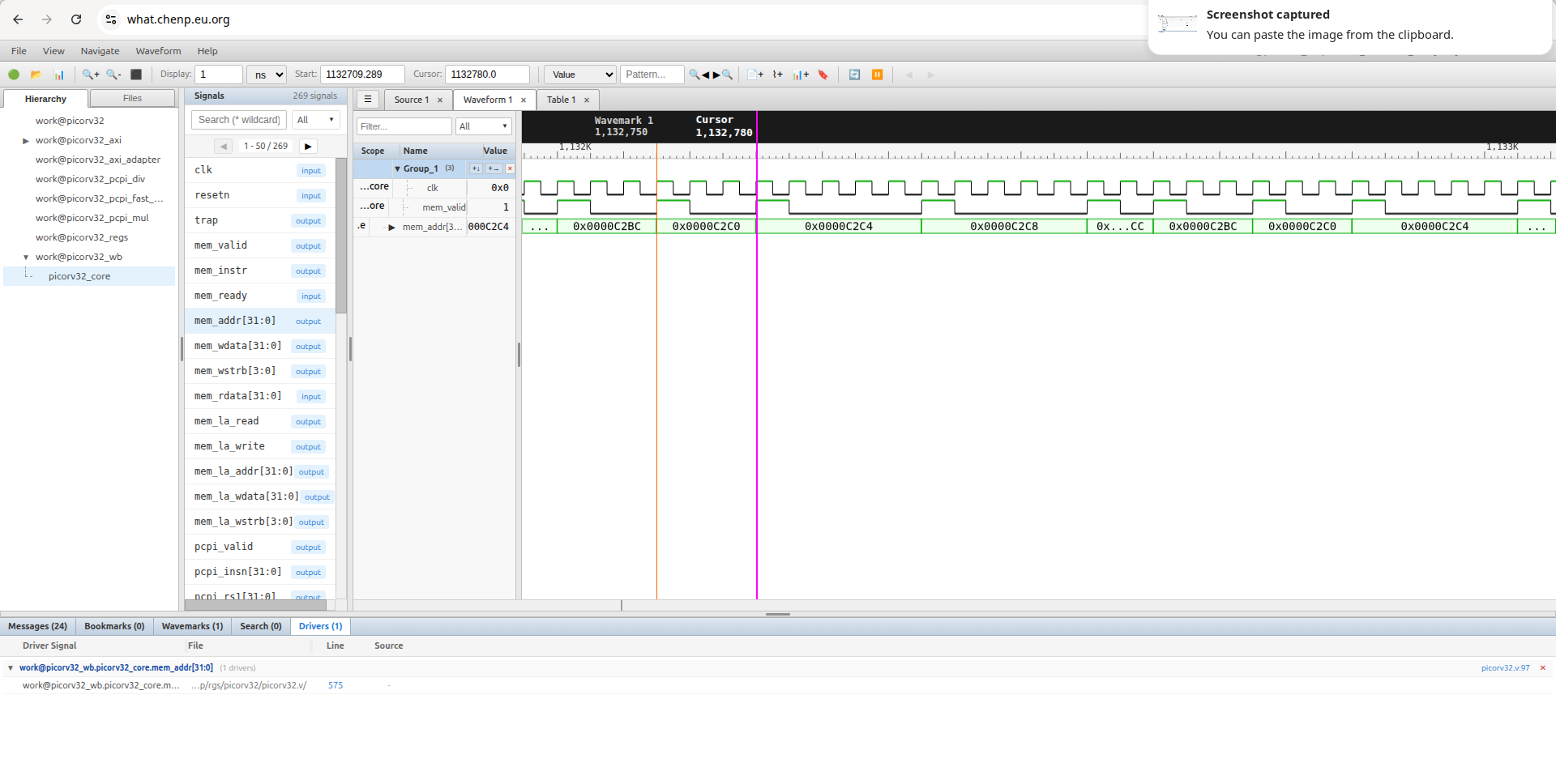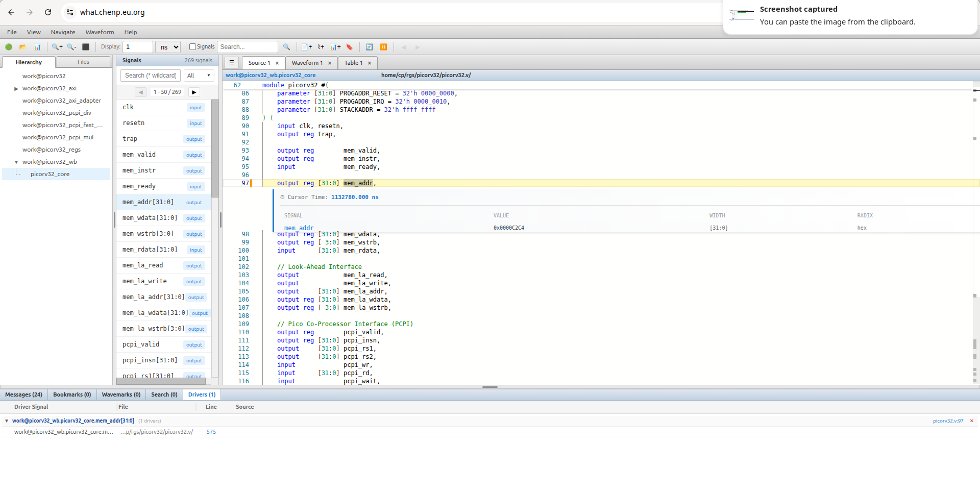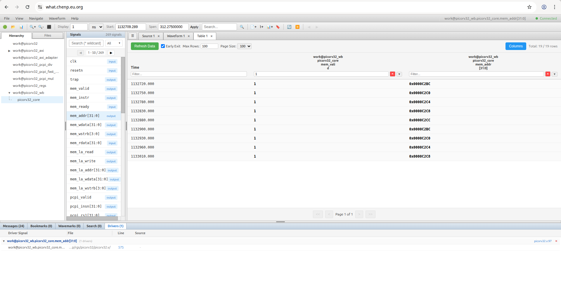 点击连接按钮并使用默认设置,即可访问演示服务器。选择 picorv32 kdb 和 fst 波形开始调试。