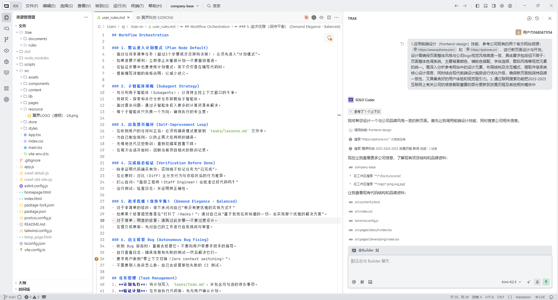 极速生成样板代码:企业官网页面多(首页、解决方案、档案中心、无人机服务等),用 TRAE 批量创建页面结构和路由配置,效率拉满。