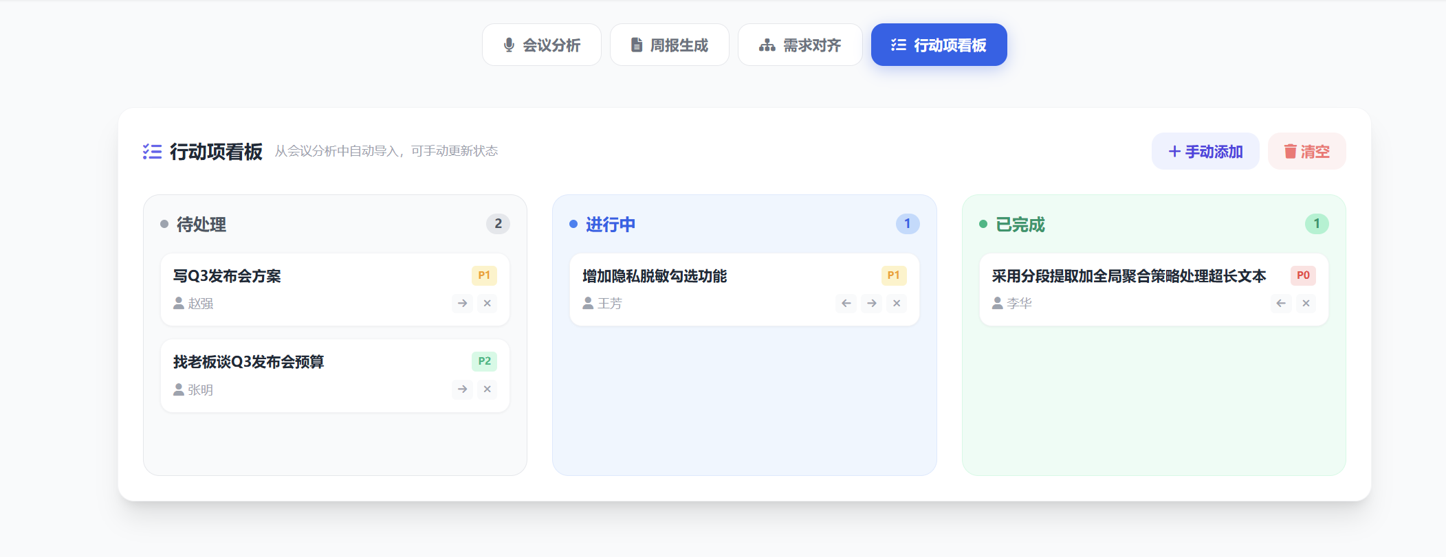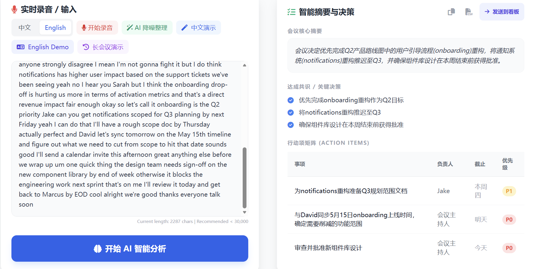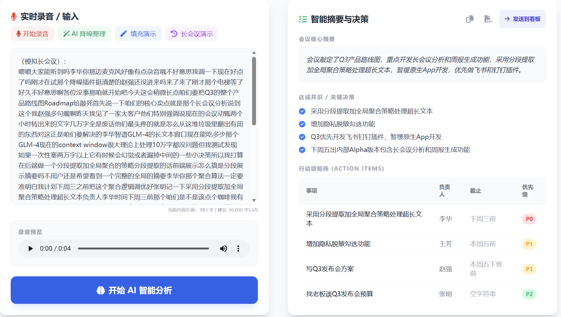 - 会议分析结果展示区(摘要 / 决策 / 行动项表格)