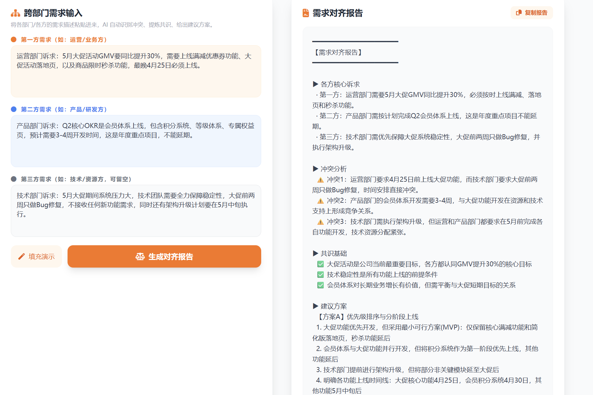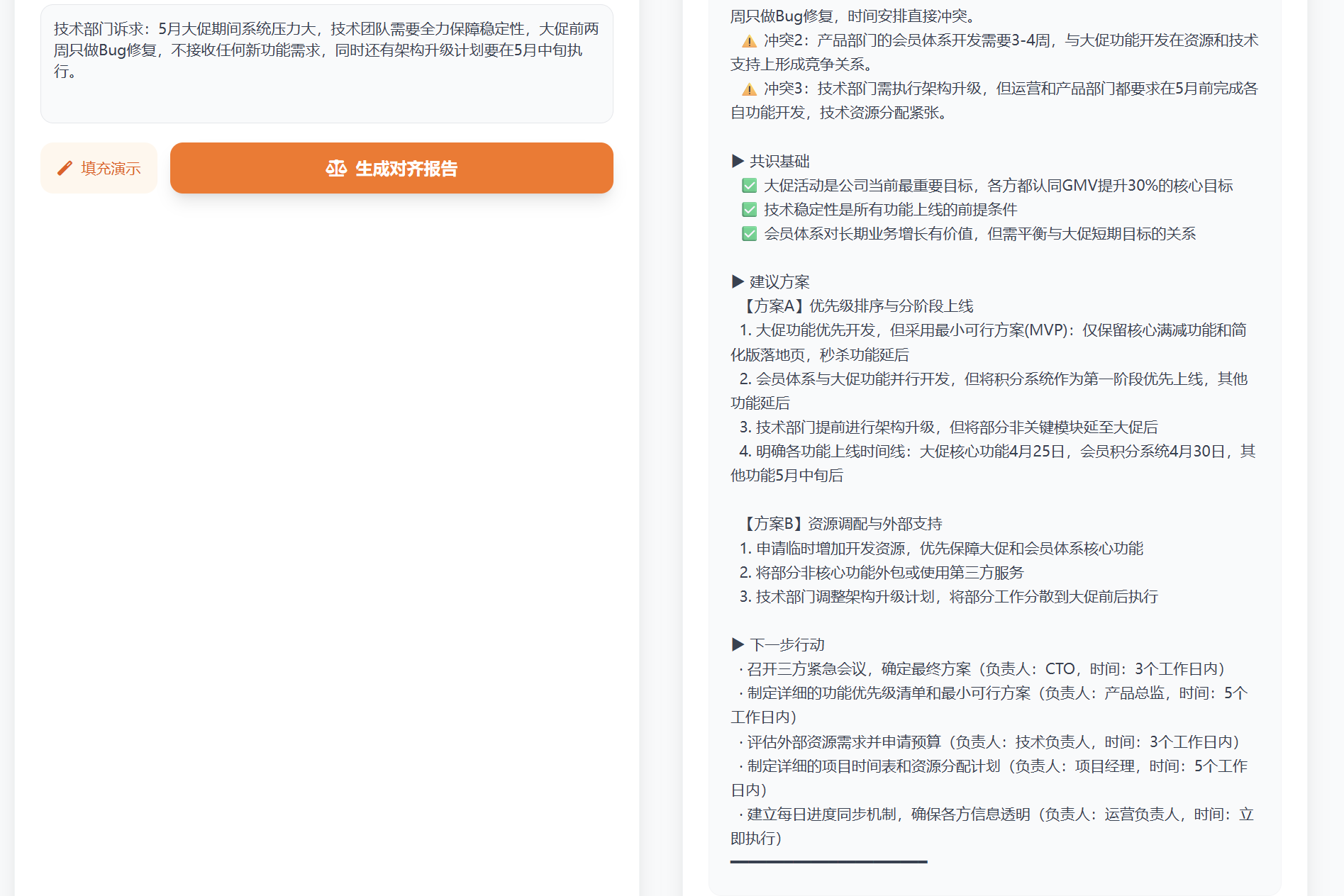 - 跨部门对齐(冲突点识别+共识方案)