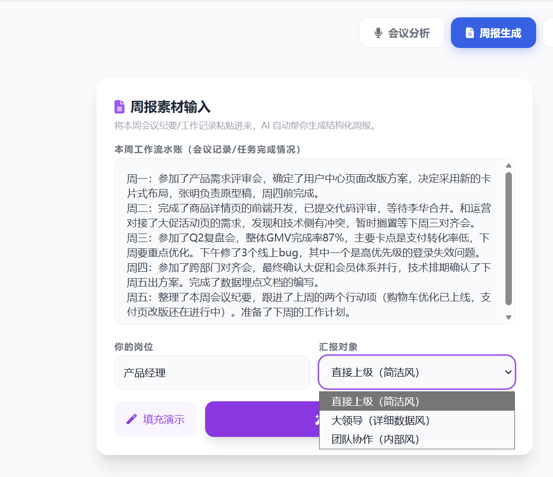 - 周报生成区(支持日报/周报切换)