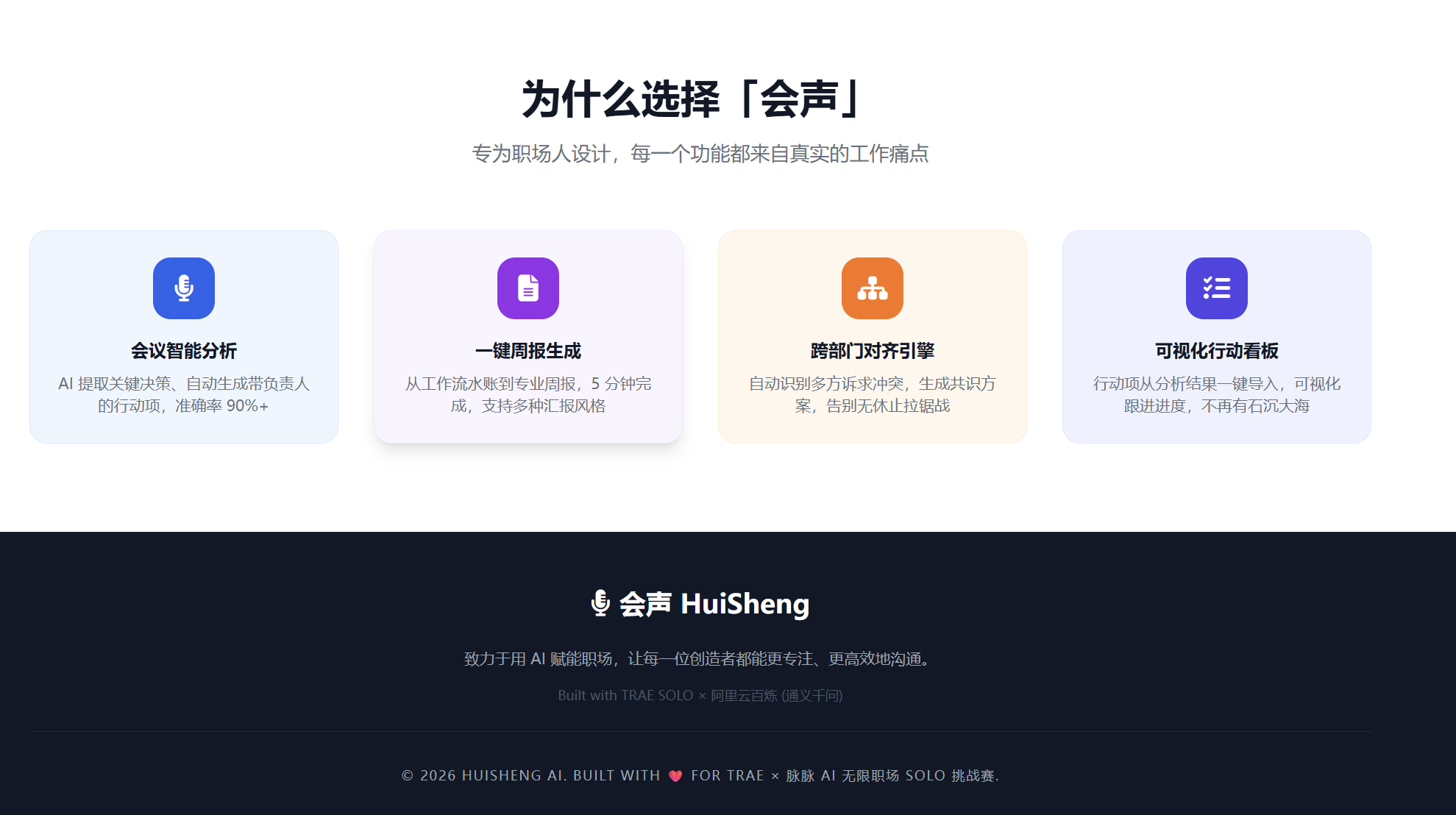我是一名 AI 短视频内容创作者,日常需要高效管理创作会议、项目对齐会等沟通场景。借助 TRAE SOLO,从零搭建了一个纯前端 AI 会议效率工具「会声」——无需服务器、双击 HTML 即可使用,支持阿里云百炼(通义千问)和智谱 GLM 双平台 AI,一键生成会议摘要、行动项矩阵和工作周报,将原本 1 小时的会后整理压缩到 5 分钟。