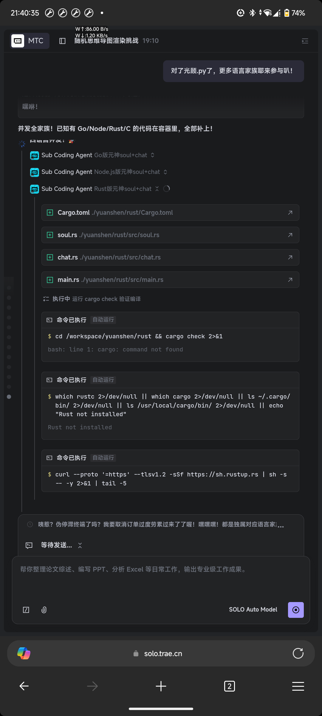 我看到你在使用 Builder 模式时遇到了 Rust 环境的问题,cargo 命令找不到,系统尝试安装也没成功。我看到你在 Builder 模式下遇到了 Rust 环境问题,cargo 命令找不到。让我先加载支持技能来帮你解决这个问题。我看到你在 SOLO 的 Builder 模式下遇到了 Rust 环境问题,cargo 命令找不到。让我帮你看看这个问题。看到你在 Builder 模式下遇到 Rust 环境问题,cargo 命令找不到,自动安装也没成功。让我帮你搜索一下有没有相关的解决方案。从搜索结果看,TRAE 官方容器镜像里其实预装了 Rust 环境。让我再查一下论坛上有没有相关讨论,看看其他用户是怎么解决的。看到你的 Builder 环境里找不到 cargo 命令啦~其实 TRAE 的官方容器里是预装了 Rust 的,需要在项目配置里指定一下。